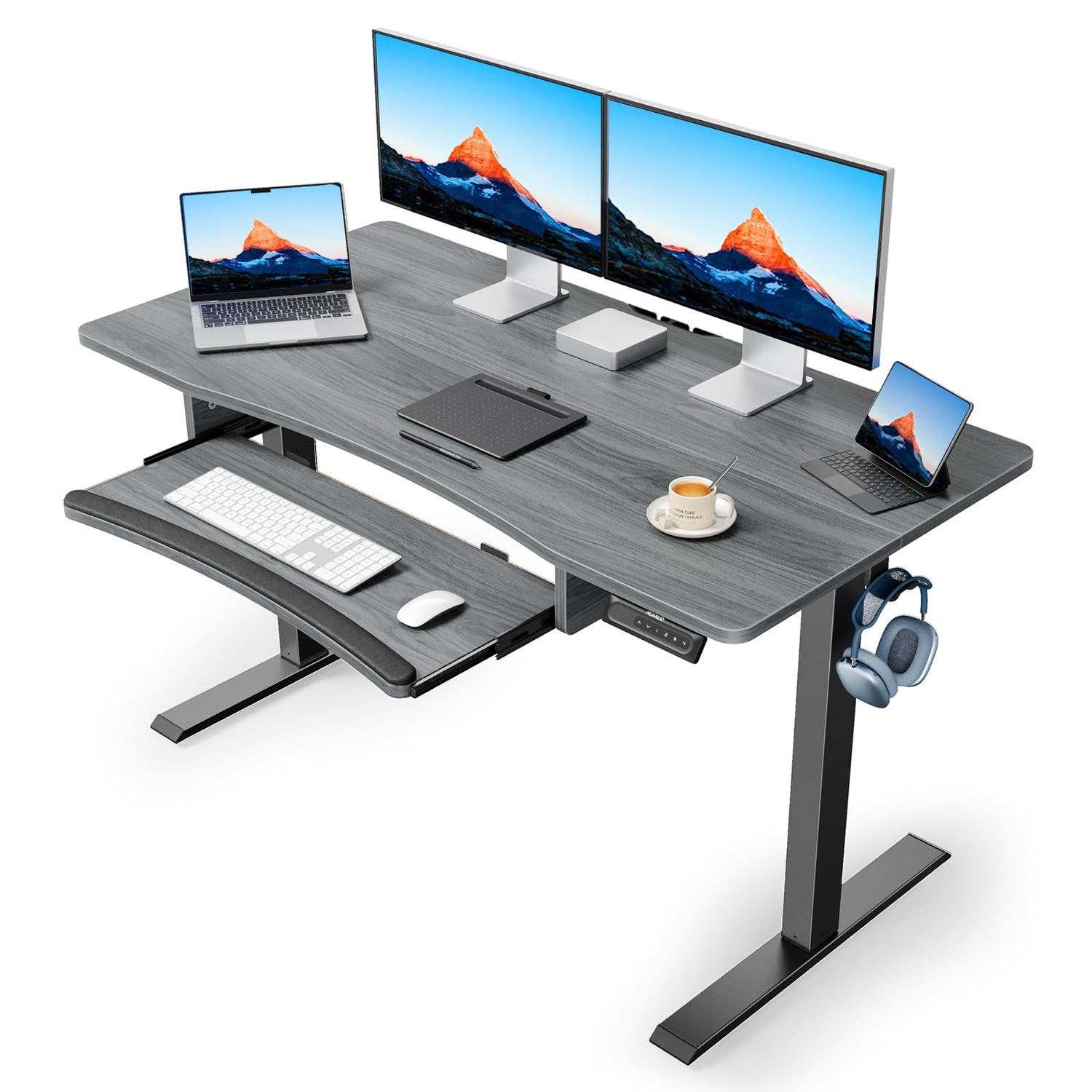 - Upgraded Ergonomics: This height-adjustable desk enables you to tailor your setup for optimized ergonomics with all the right angles. Sit or stand and always have the right height. The added keyboard tray brings your wrists, elbows, and shoulders into alignment without compromising the setup and view.