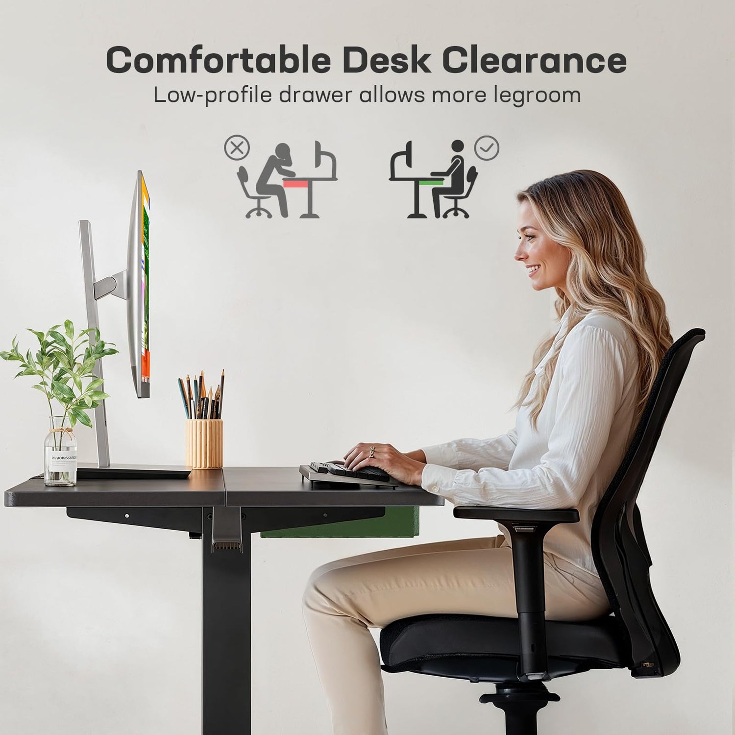 • Ergonomic Sit Stand Design: The drawer of this desk is designed to be low-profile without obstructing your legs while still offering easy access when standing. One hour of standing can help to burn just as many calories as a fraction of time exercising, making this adjustable desk a great option for overall well-being.
