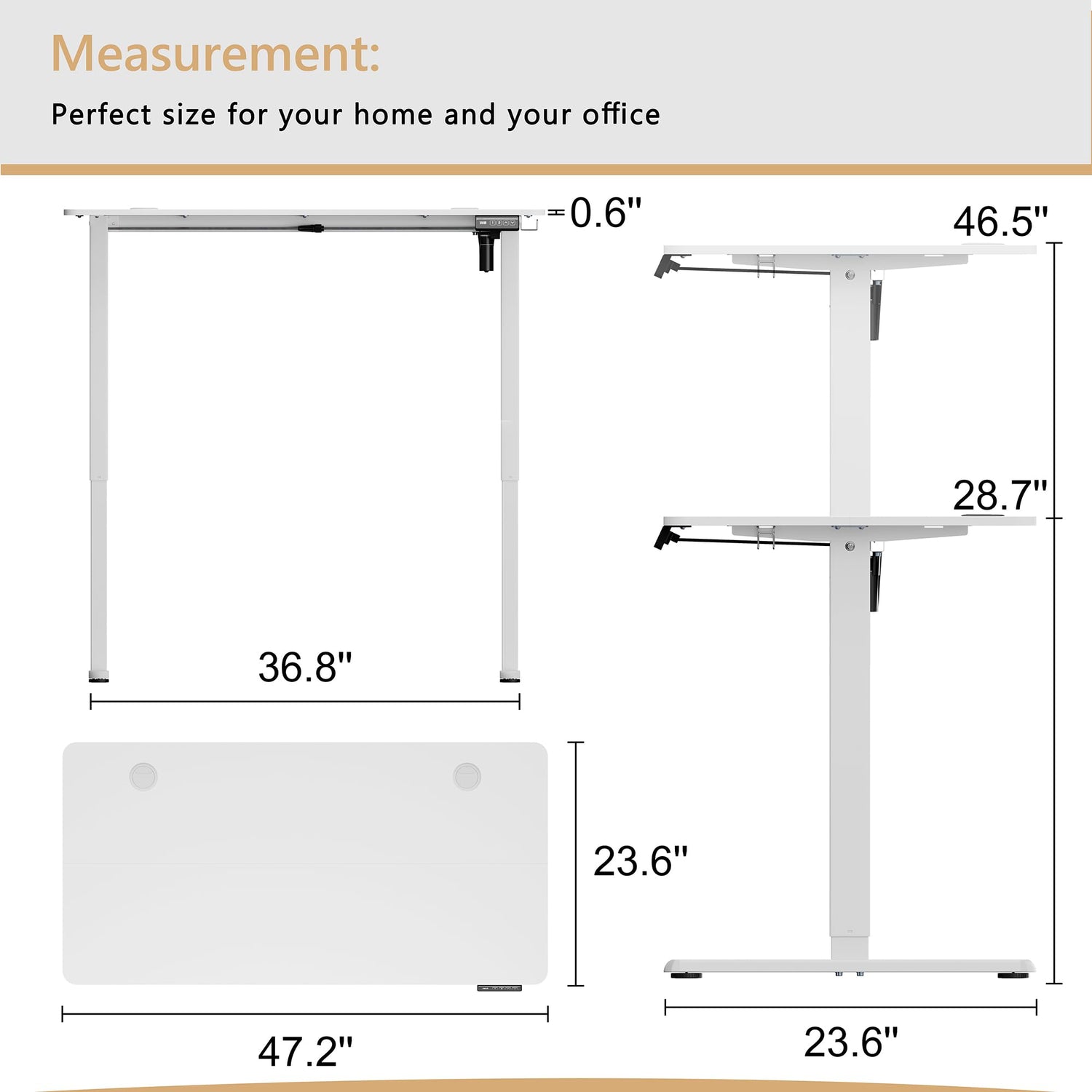 - Memory Height: The electric lift system can save you from the manual height adjustment. Meantimes, the height adjustable desk has 2 memory preset buttons to customize your desired heights from 28.7 inch to 46.5 inch