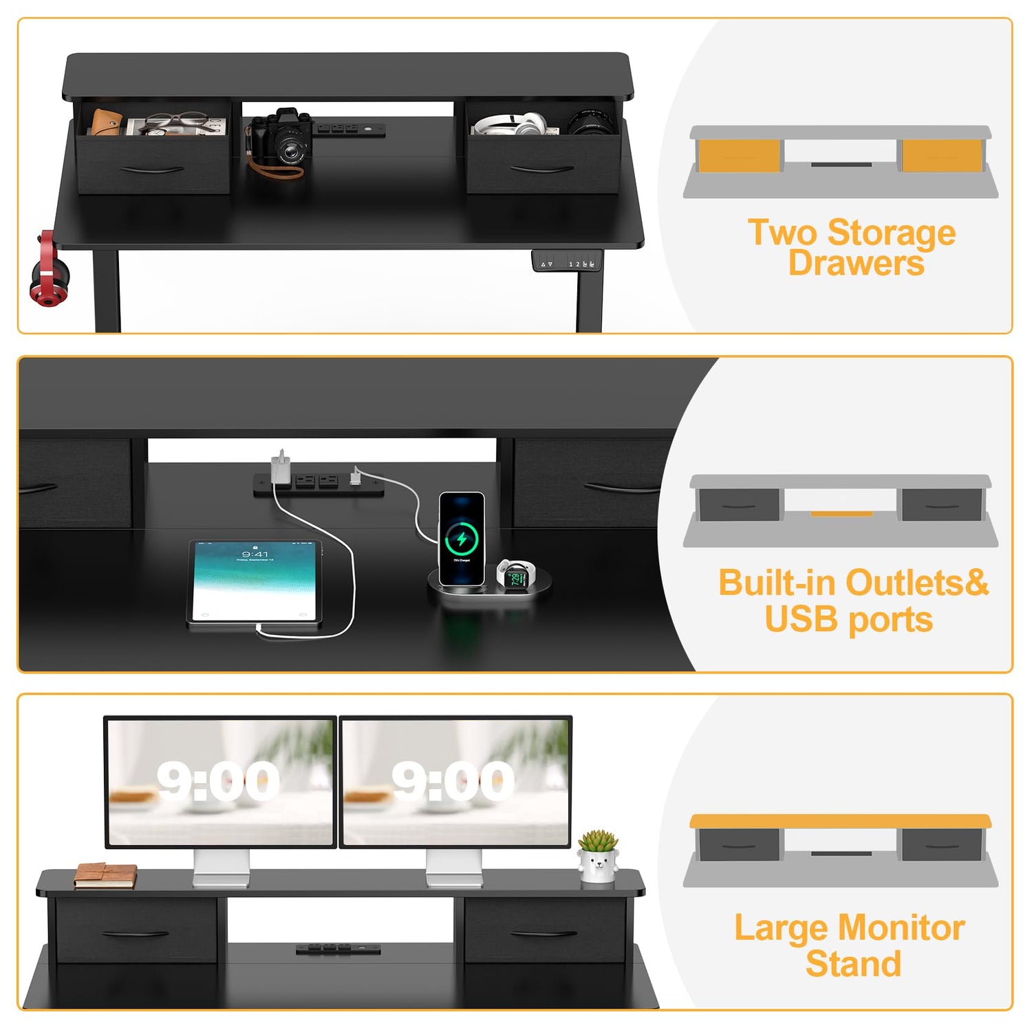 Mr IRONSTONE Standing Desk, 47 x 24 Inches Electric Height Adjustable Desk with 3 AC Outlets & 2 USB Ports, Stand Up Desk with 2 Drawers and Large Monitor Stand, Black
