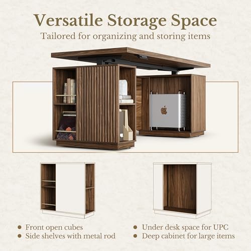 - Ample Storage Space:This Executive standing desk features multiple open shelves under the desktop, providing easy access storage for books, binders, and essential work items. Another convenient, specially designed compartment on the right side to securely store and organize your computer tower (CPU).