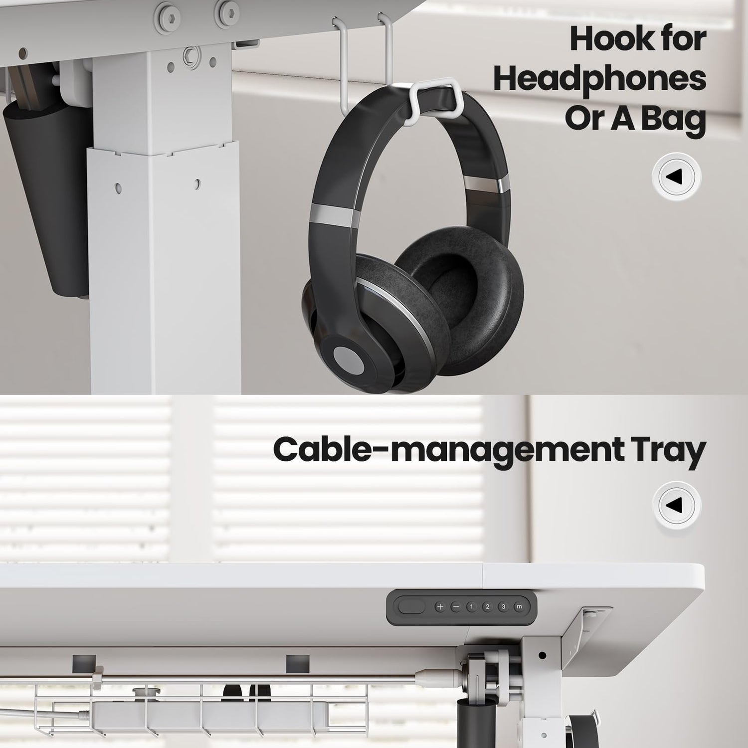 - Organize Your Workstation : 48"x24" eco-friendly desktop provides you with a spacious workspace. (The 40-inch version is a whole-piece) Integrated cable management tray and hooks for headphones or bags, ensuring a tidy workspace. Say goodbye to cable chaos and focus on what matters!