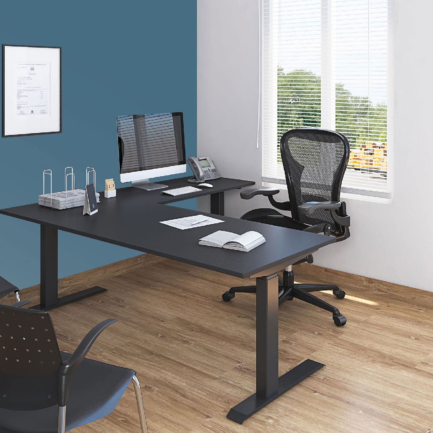 Details: If you've wanted to enjoy the many benefits that standing desks offer, need maximum space, but dread a complicated setup, the Stand Up Desk Store Triple Motor Electric L Shaped Desk / Standing Desk with EZ Assemble Frame is an ideal choice. Thanks to an innovative frame design, it comes almost entirely assembled. All you need to do is unfold the legs, attach the feet and arms, then attach the tops. Once assembled, the three-stage telescoping legs offer an impressive 25.6 inches of push-button electric height adjustment, so you can easily set the stand up desk to any height between 26 inches up to 51.6 inches. This allows users of virtually any height to effortlessly transition between sitting and standing at a rate of 1.2" per second. Since the programmable keypad will remember your favorite settings, you can find your preferred positions with just the touch of a button. Other user-friendly features of this adjustable height desk is the triple motor design, which lets you raise and lower up to 220 pounds. Measuring a massive 70.9 by 59 inches, you can enjoy extra room for triple monitors (or more), additional equipment, or simply one of the roomiest work surfaces available. The integrated desk return/desk extension can be installed on either the left or right side. An exclusive anti-collision mechanism prevents you from accidentally lowering the desk on top of objects underneath. Independently tested and certified for quality and safety. Comes with included furniture glides. 2-inch casters with locking brakes are available separately.