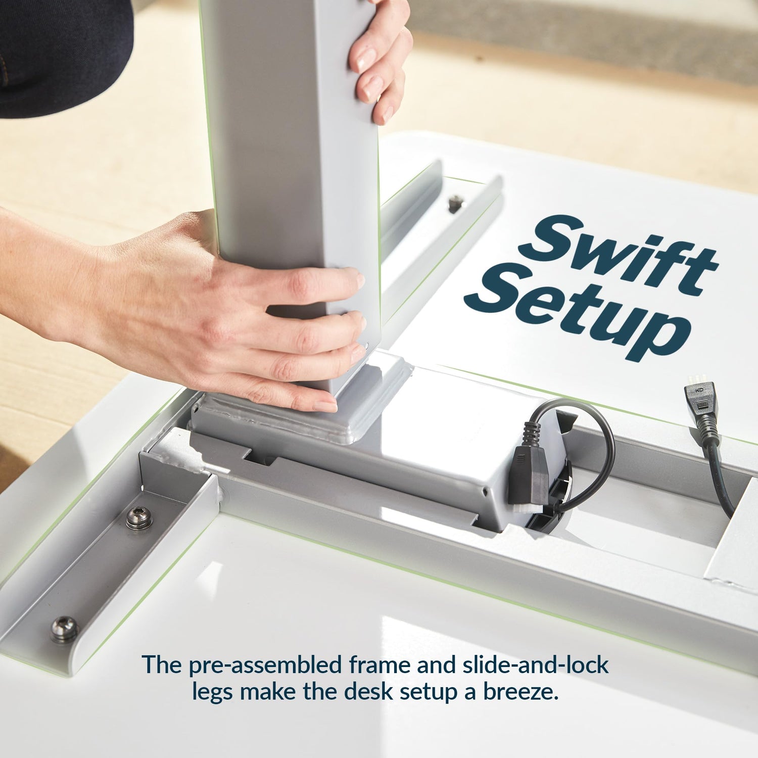 - Swift Setup and Stability: With a pre-installed frame and slide-and-lock leg, our white motorized desk ensures easy assembly and stability. Enjoy smooth sit-to-stand height transitions (25" to 50 ½") with 4 programmable settings and a quiet motor.