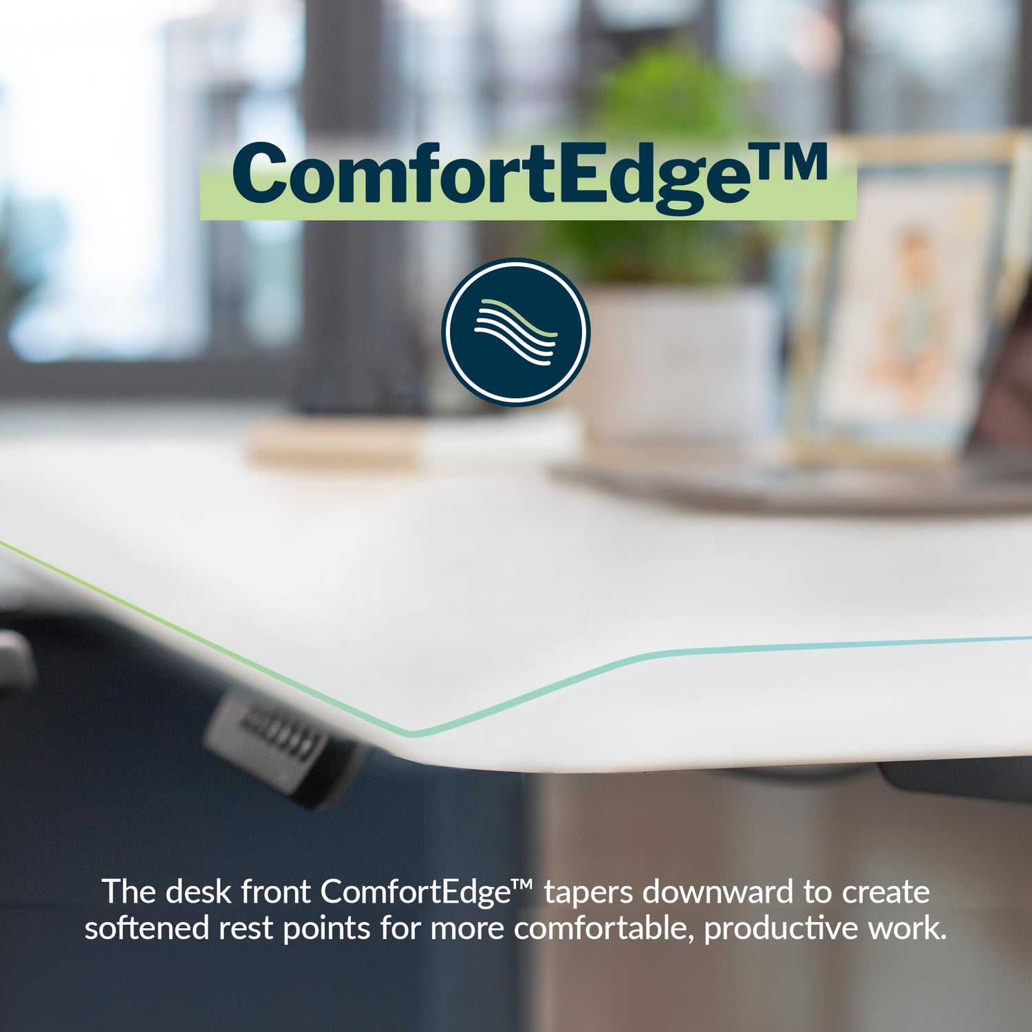 - ComfortEdge Innovation: The Vari white smart desk features modern design and an advanced ergonomic front slope edge for comfortable work, natural typing angles, and reduced pressure points in the forearm, elbow and wrist during extended use.