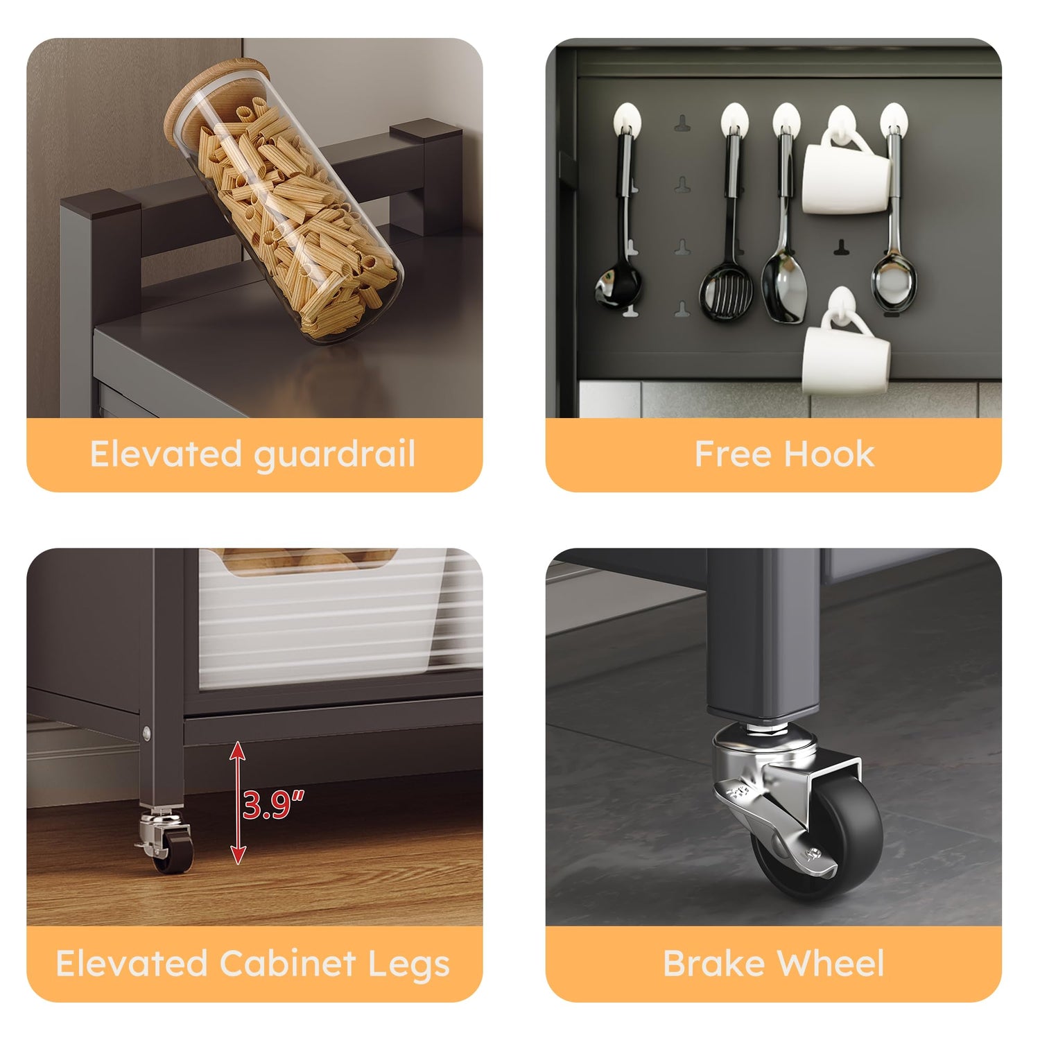 - [Newly Upgraded Bread Rack] The kitchen utensil cabinet boasts a thick, wavy-patterned flip-style PC door panel with a transparent and textured finish. It features raised handles on both sides to prevent items from falling, offering ample storage space with eight S-shaped hooks. It's ideal as a microwave, coffee bar, and spice rack organizer, freeing up space on countertops and cabinets.