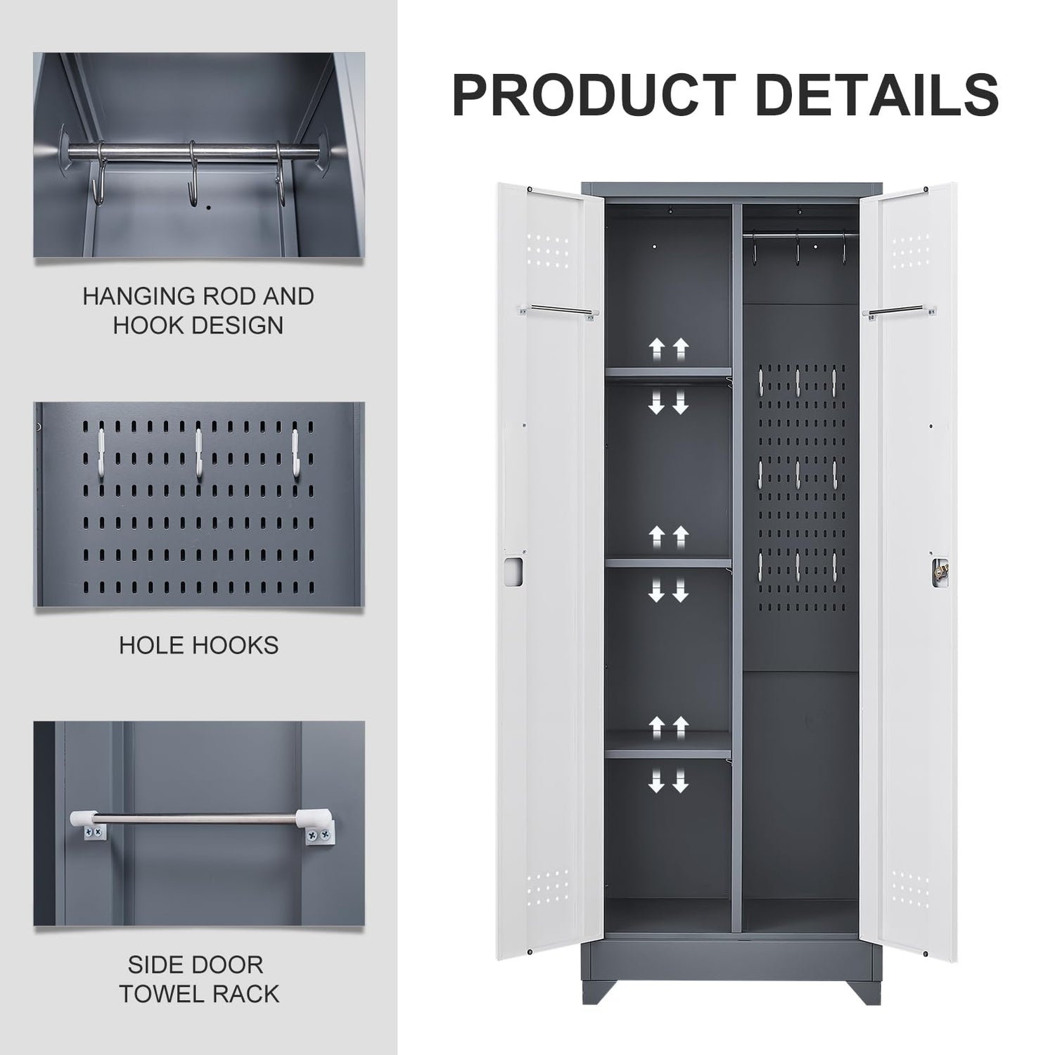 - 👍【Versatile Use】This cleaning metal storage cabinet comes with multiple accessories to meet your needs. Adjustable shelves accommodate items of varying heights. The right side is equipped with a hanging rod and S-hooks, and the hanging rod on the door can be used for towels and other items. The perforated panel design makes it easy to store and retrieve tools, keeping the space tidy and organized. The cabinet can store documents, brooms, mops, tools, towels, clothes, and more.