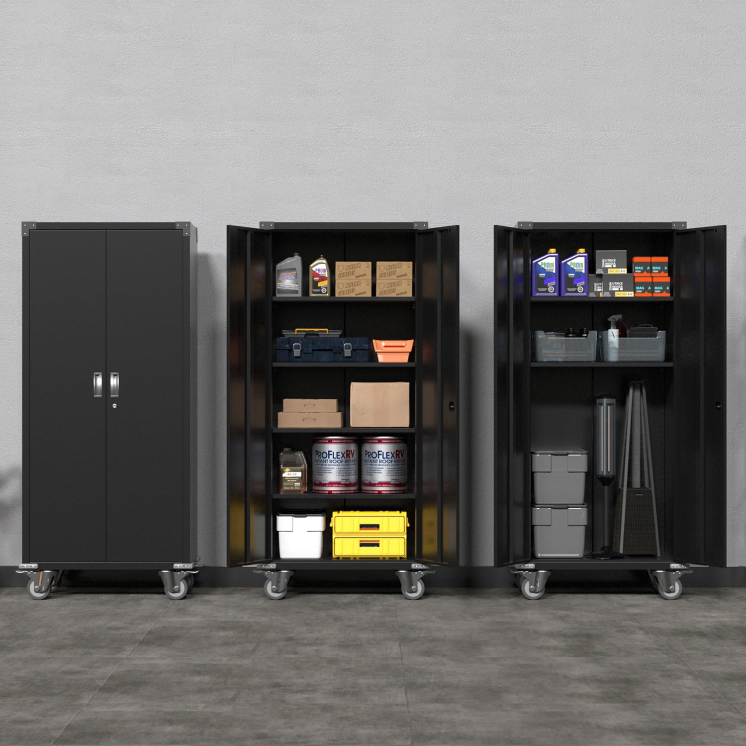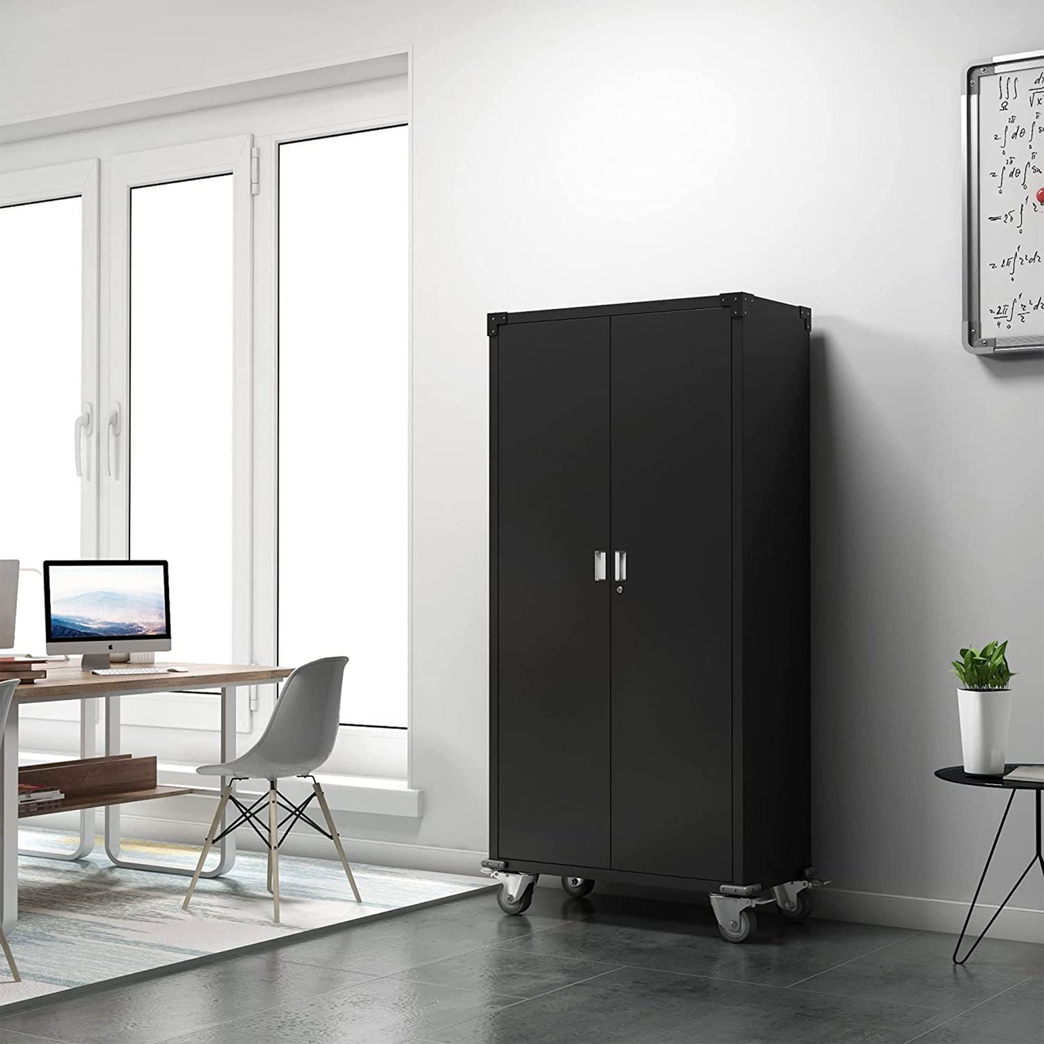 Details: Keep hazardous materials or important documents safe in your home or office with the Rolling Locking Metal Storage Cabinet with Adjustable Shelves from Aobabo. This storage cabinet features 5 shelves total and 4 shelves that can be adjusted up or down to accommodate larger or taller items. Both doors lock shut to keep the contents secure and have high-quality handles for easy opening. With a durable steel design and 4 rubber casters, this black cabinet is a great portable storage option for garages, offices, pantries, or anywhere else you need secure storage in your home. This cabinet features angle stiffener corners, making the entire structure stronger and more stable as it moves. 2 keys are also included, so you can still open the cabinet if 1 key is lost. This storage cabinet measures 32.3 inches long, 16 inches wide, and 72 inches tall to keep things safe in your home or office space. Securely organize your garage, office, or other areas in your home with the Rolling Locking Metal Storage Cabinet with Adjustable Shelves from Aobabo.