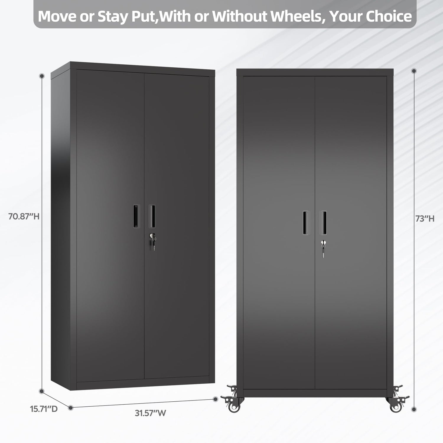 Aobabo 73''H Metal Garage Storage Cabinet with Wheels,Steel Cabinets with 2 Doors and 4 Adjustable Shelves for Home Office,Required Assembly,Black
