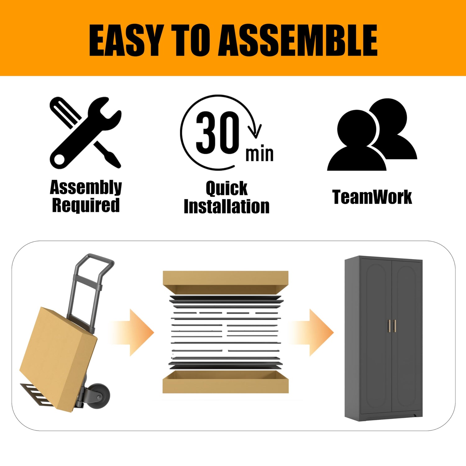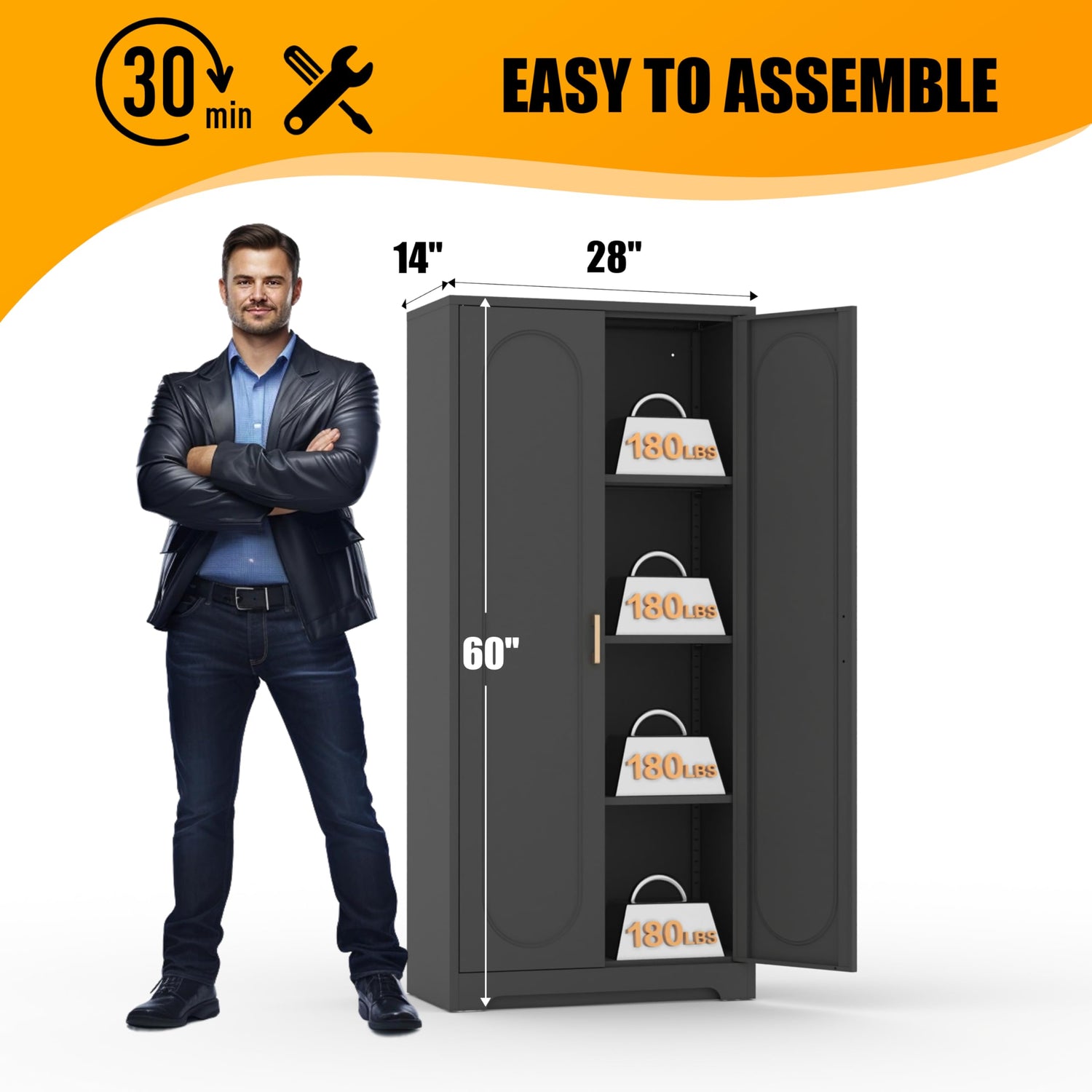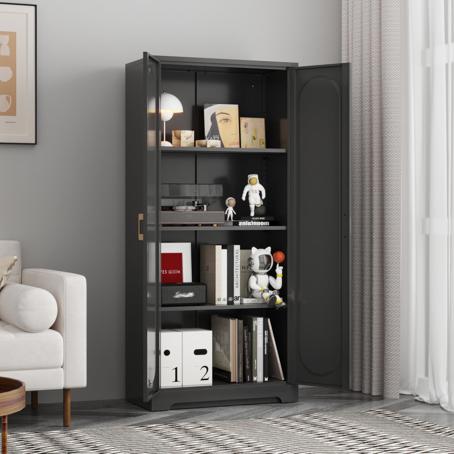 - Stylish Looking Design: The metal storage cabinet features a sleek circl arc door design, the doors come with 2 beautiful gold handles and have magnetic door stops on the top inside of the doors. It looks more designer compared to other plain solid color doors. This black pantry storage cabinets adds character and charm to the home office