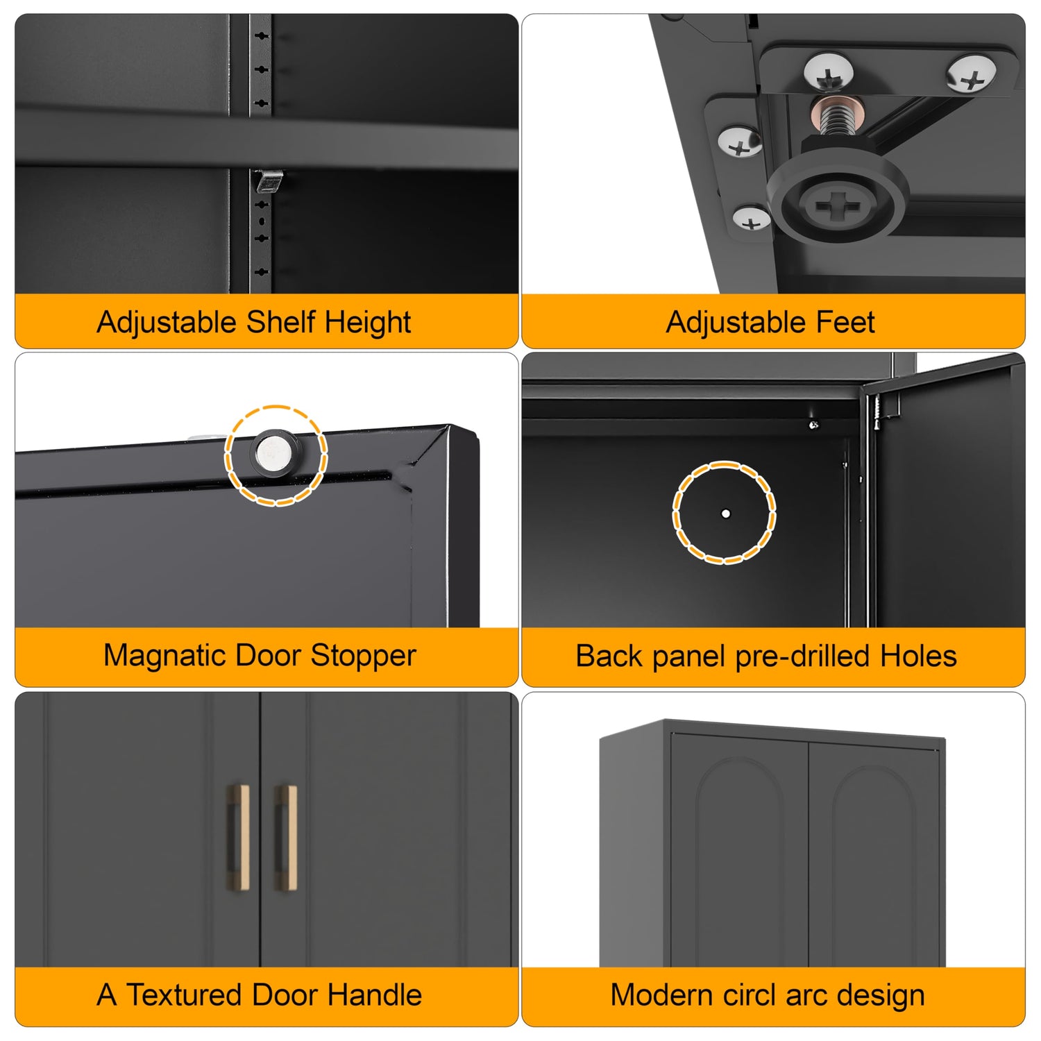 - Large Storage Capacity: The black cupboard is equipped with 3 adjustable shelves that can be moved up and down or removed as needed, creating flexible storage space. The maximum load-bearing capacity of each shelf is 180 pounds and is not easily deformed. The metal storage cabinets has adjustable feet on the bottom to ensure the stability of the cabinet