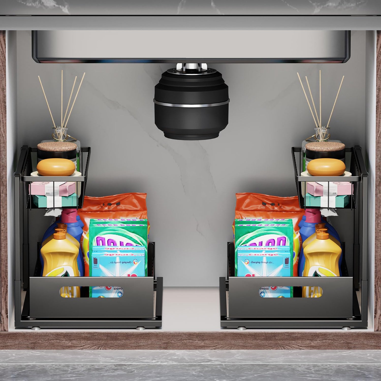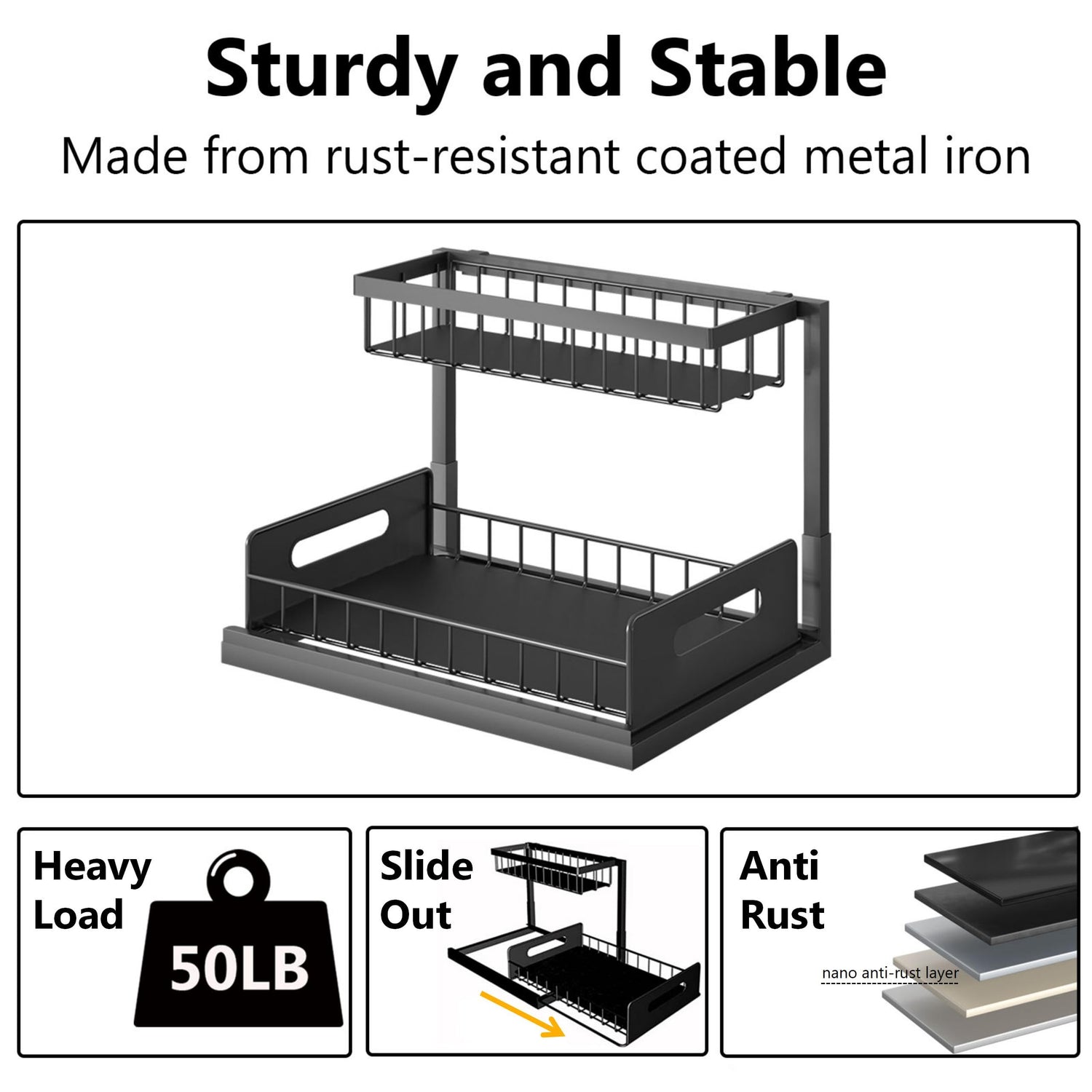 Ceetug Under Sink Organizers and Storage 2 Tier Slide Out Kitchen Cabinet Organizer Sturdy Metal Bathroom Storage (Black, 2 Pack)