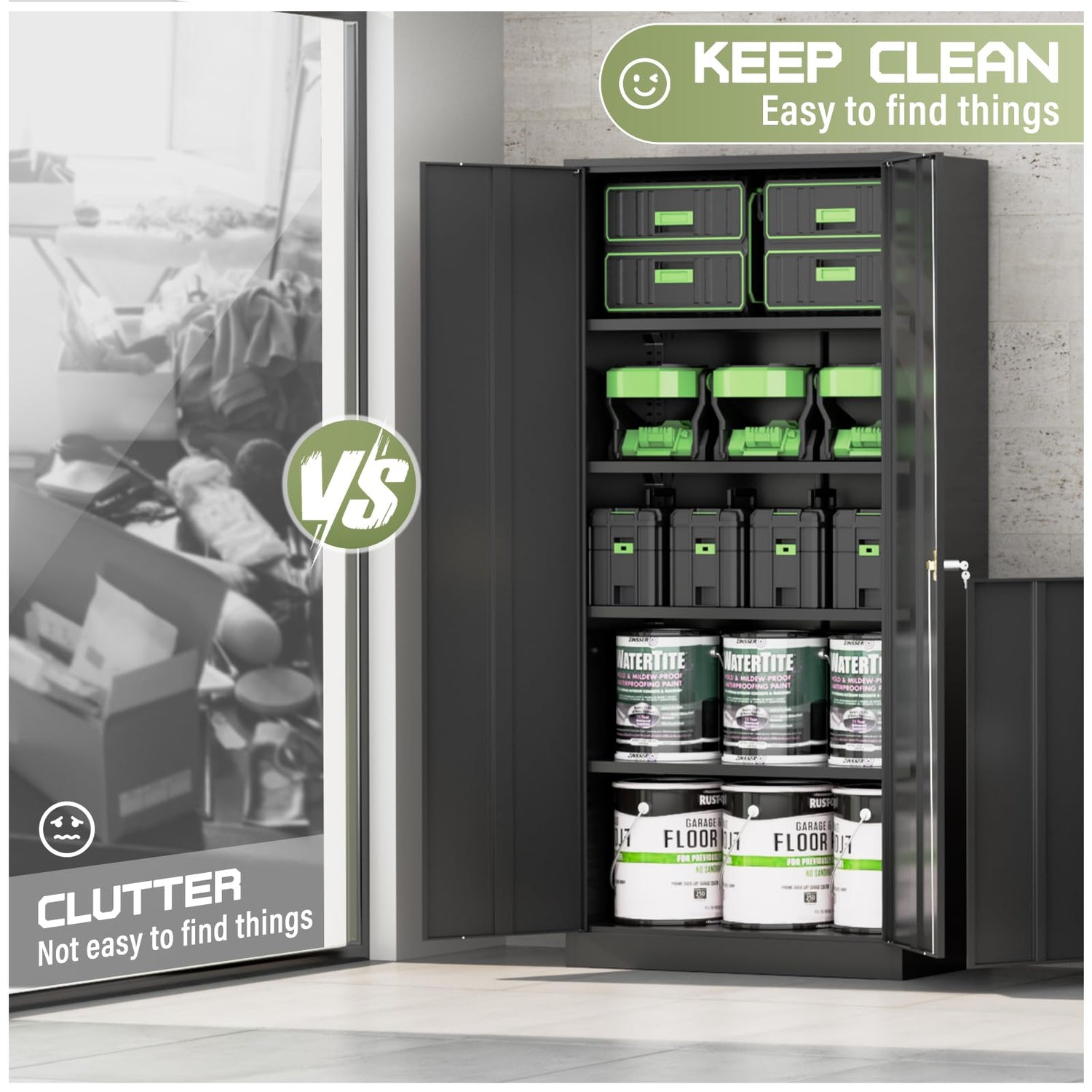 - 【Multiple uses】Multi-functional locking storage cabinets help to organize items and avoid clutter. The storage cabinet is perfect for storing cans, pet supplies, cleaning supplies, books, heavy-duty tools, and other items.