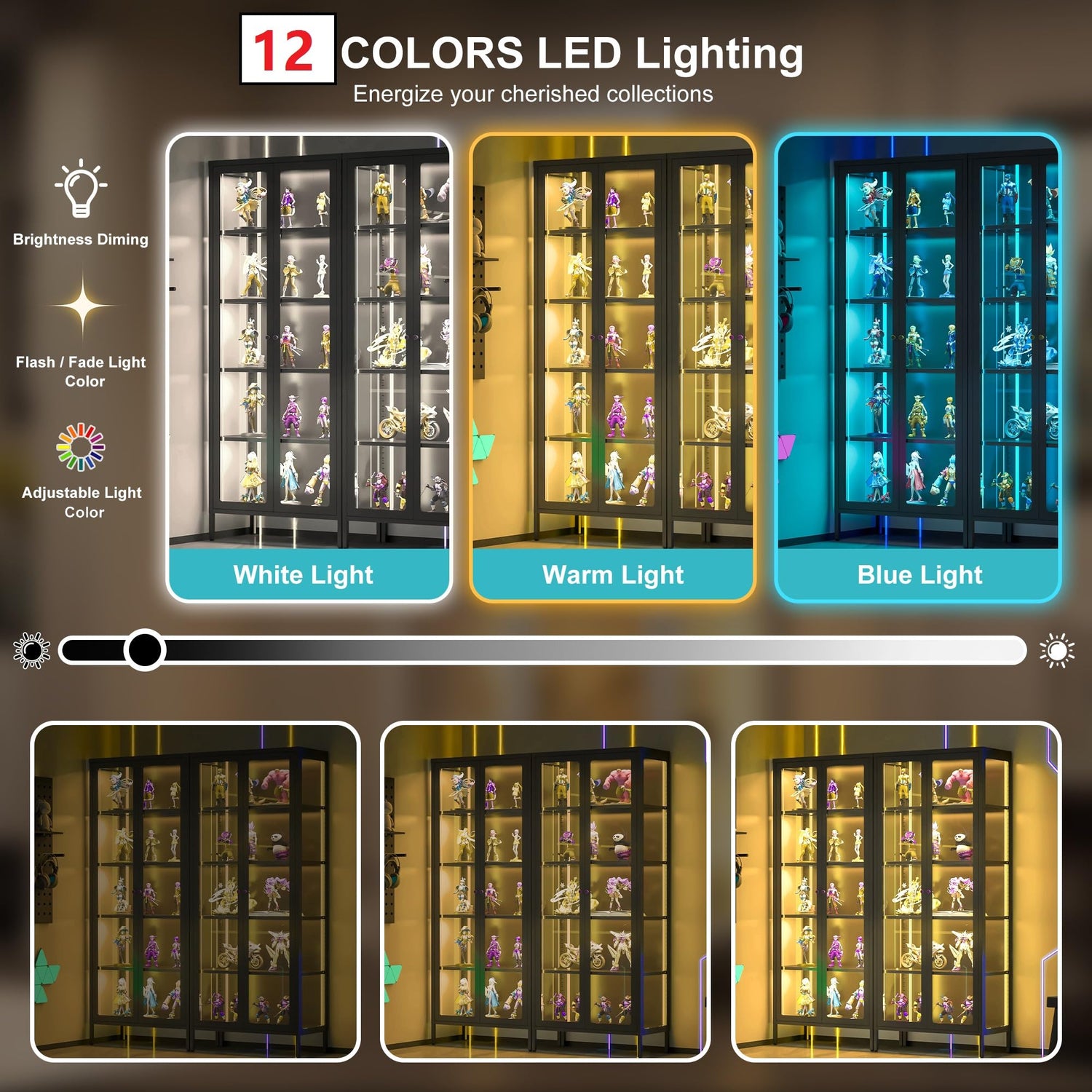 - 【12 Colors RGB Lights】Enhancing your collectibles with flair, the curio cabinet features an RGB light strip with 12 color options. The convenient remote control allows you to effortlessly switch between colors, flash/fade modes, and brightness levels, creating a stunning display effect that brings your collection to life with a museum-like ambiance.