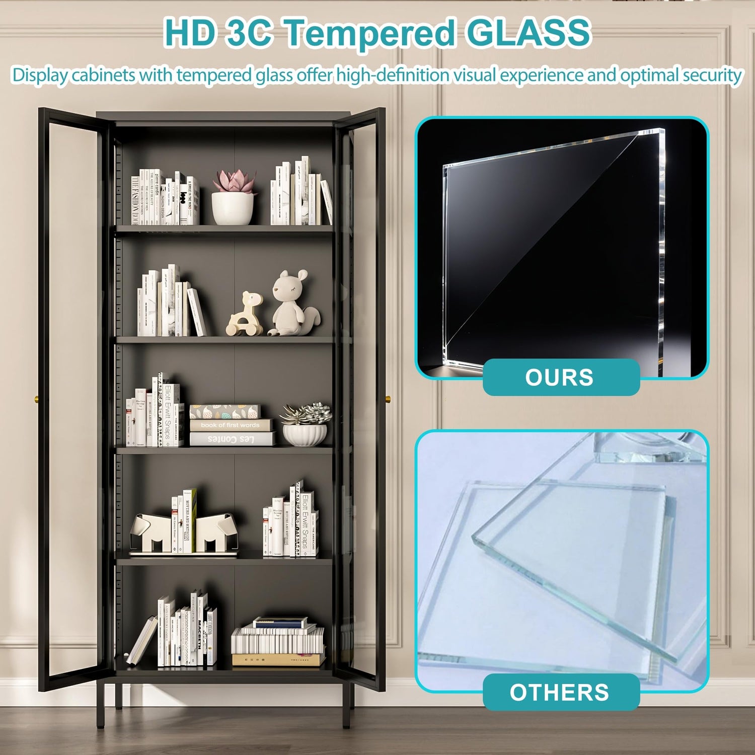 - 【Sturdy and Safe】The frame of the collectibles display cabinet are crafted with 0.5MM thick cold-rolled steel, which allows a 44 lbs load capacity for each shelf. This construction ensures enhanced stability and sturdiness compared to wooden cabinets. The anti-tilt design and anti-explosion 3C-certified tempered glass further reinforces the cabinet's stability and duribility, guaranteeing a secure and safe display environment for your valuable items.