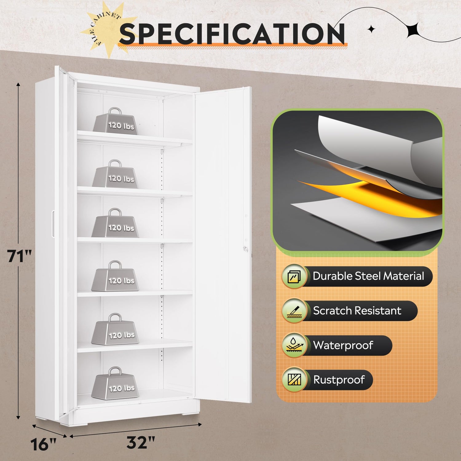 - Sturdy and Durable: This heavy duty metal storage cabinet is made from cold rolled steel plate, each tier can hold up to 120lbs and the total bearing capacity 720lbs to ensure it is sturdy and durable. With a new high quality powder coated finish, it is waterproof, rustproof and scratch resistant, making it suitable for outdoor use and easy to clean.