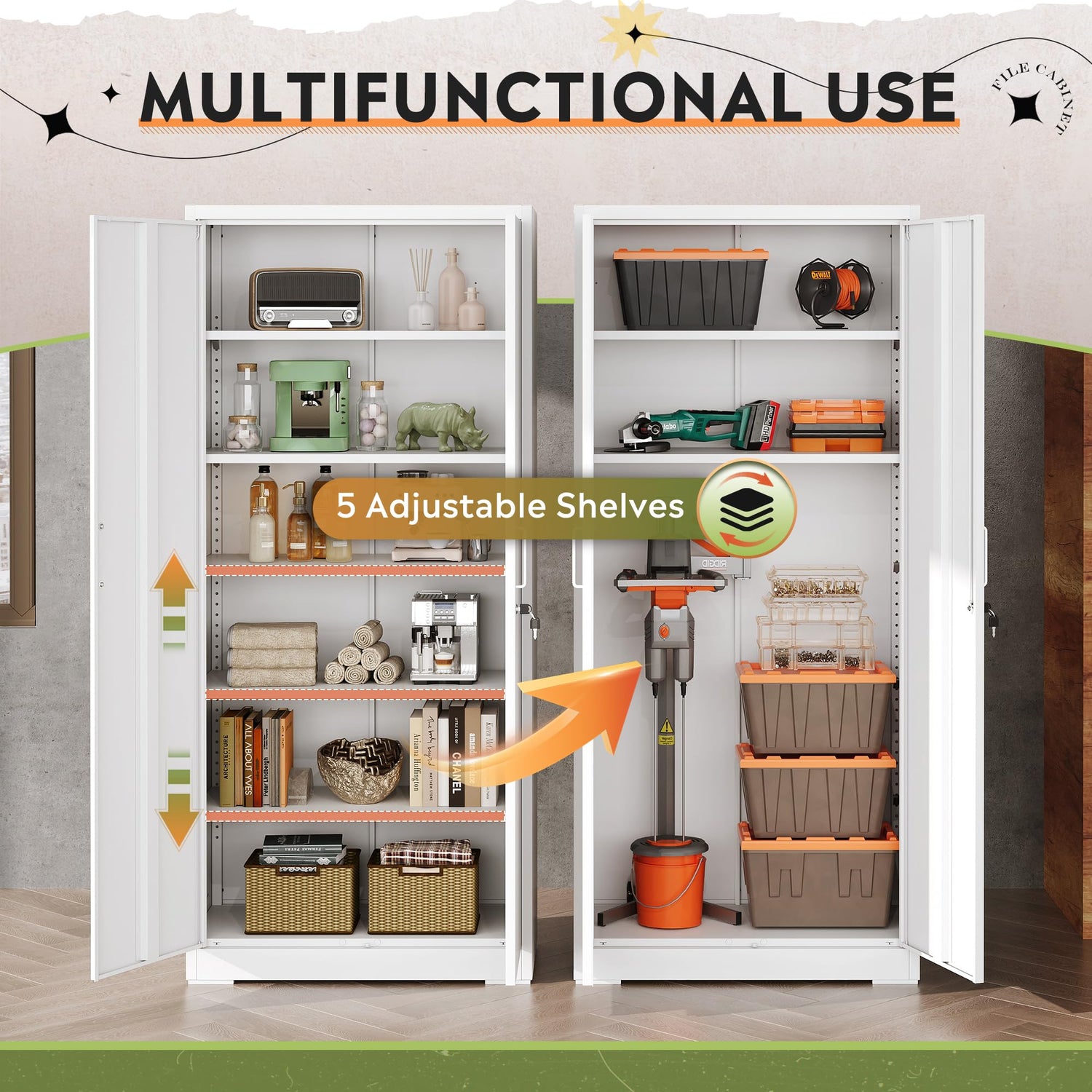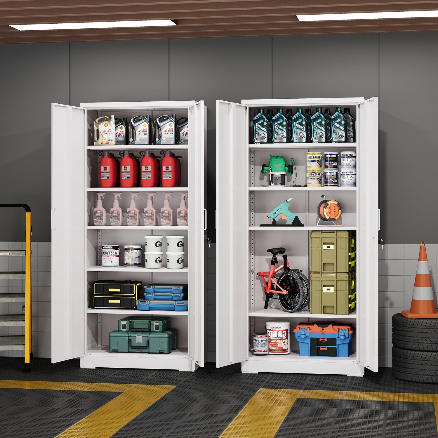 - Spacious and Flexible Storage: The DEVAISE garage storage cabinet measures 15.8''D x 31.5''W x 70.9''H and comes with 2 doors and 5 adjustable shelves, which combined with the high load capacity, allows you to store a large amount of items. Adjustable shelves provide a variety of space combinations, making it easy to adjust the height of the buckles as needed for flexible storage design.
