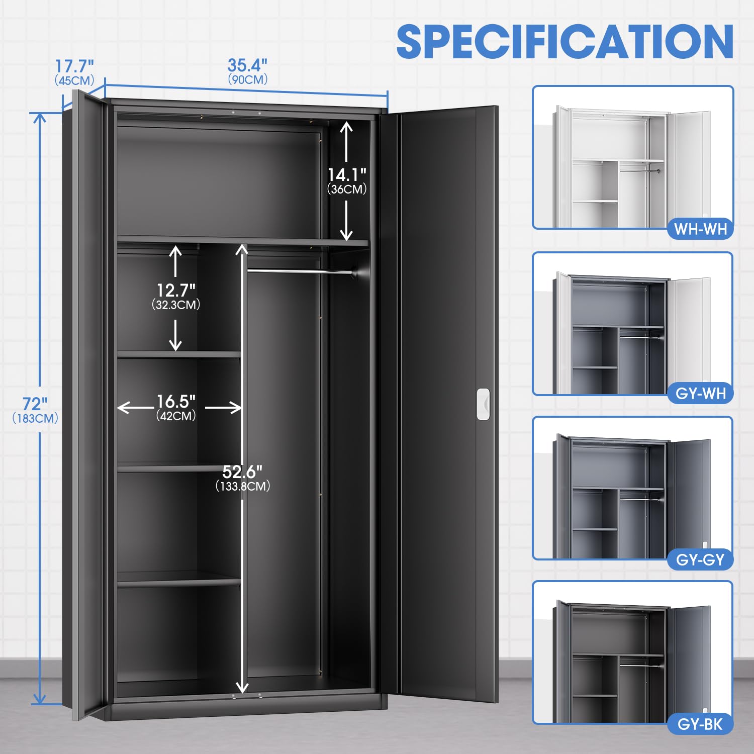 DNA MOTORING Metal Storage Cabinet, 72" Storage Wardrobe with Lock and Hanging Rod, Locking Cabinet Heavy Duty Utility Cabinet with 4 Shelves for Garage,Office,Home,Gym, Black, TOOLS-00633-BK-BK