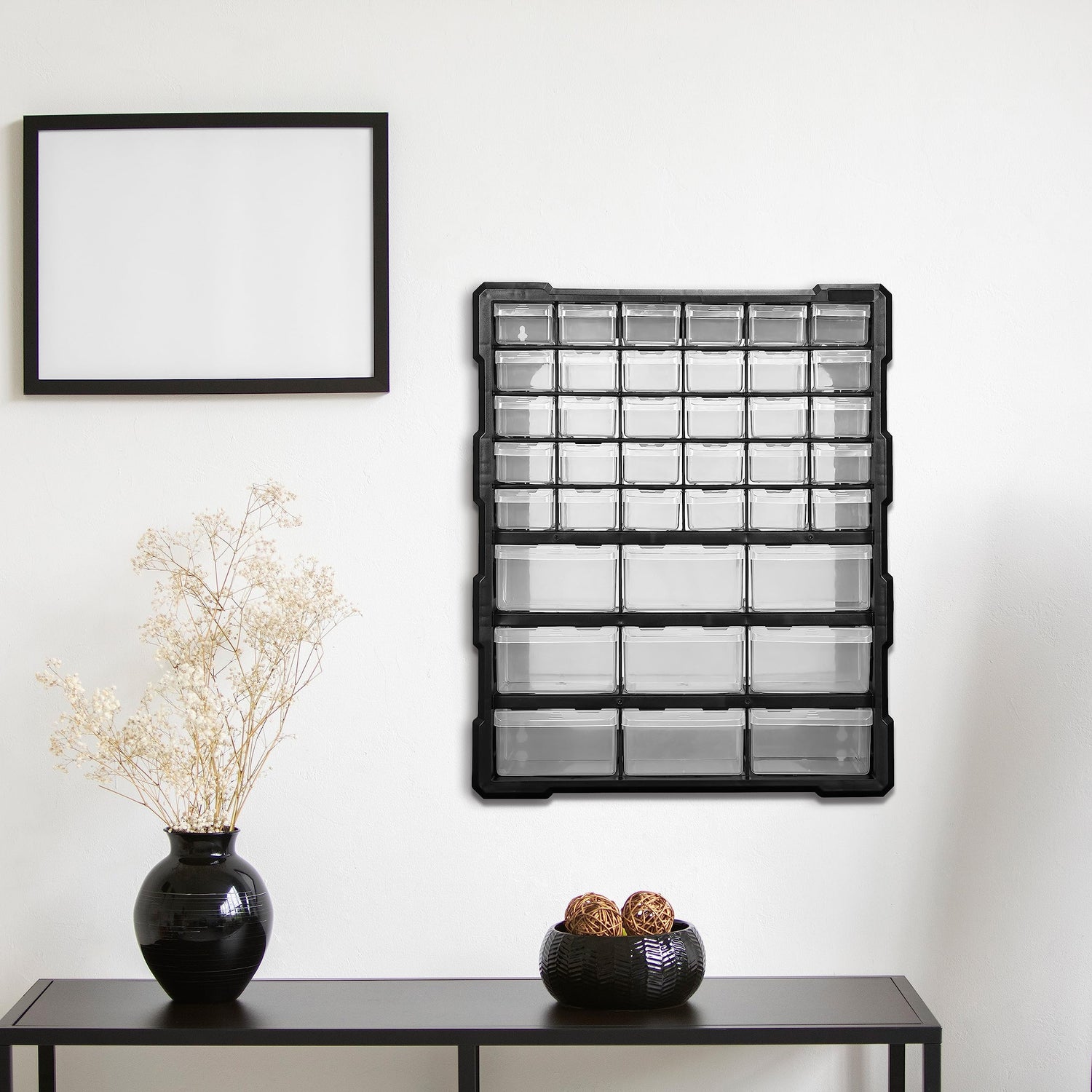 Details: Elevon Hardware and Craft Cabinet 14.8" W x 6.3" D x 18.7" H, 39 Drawers, Black