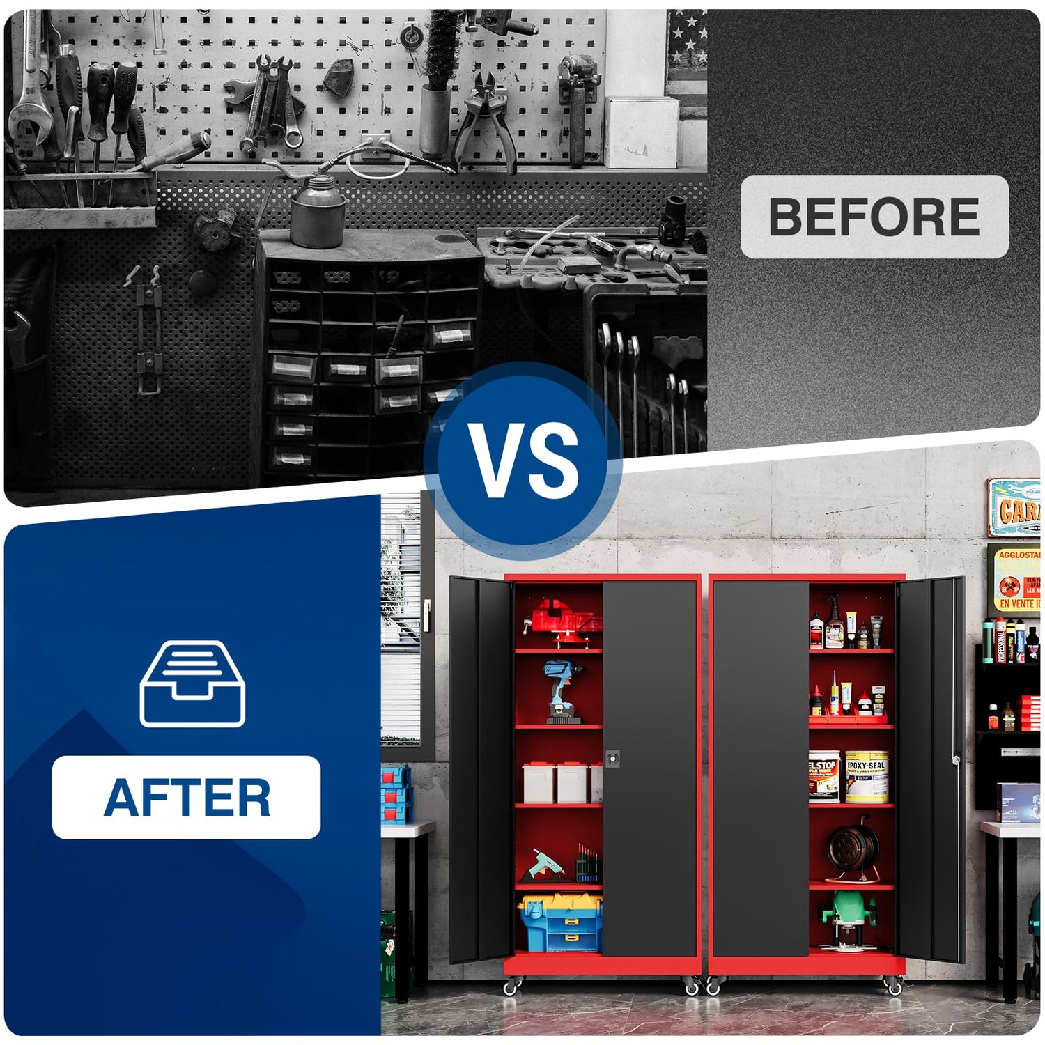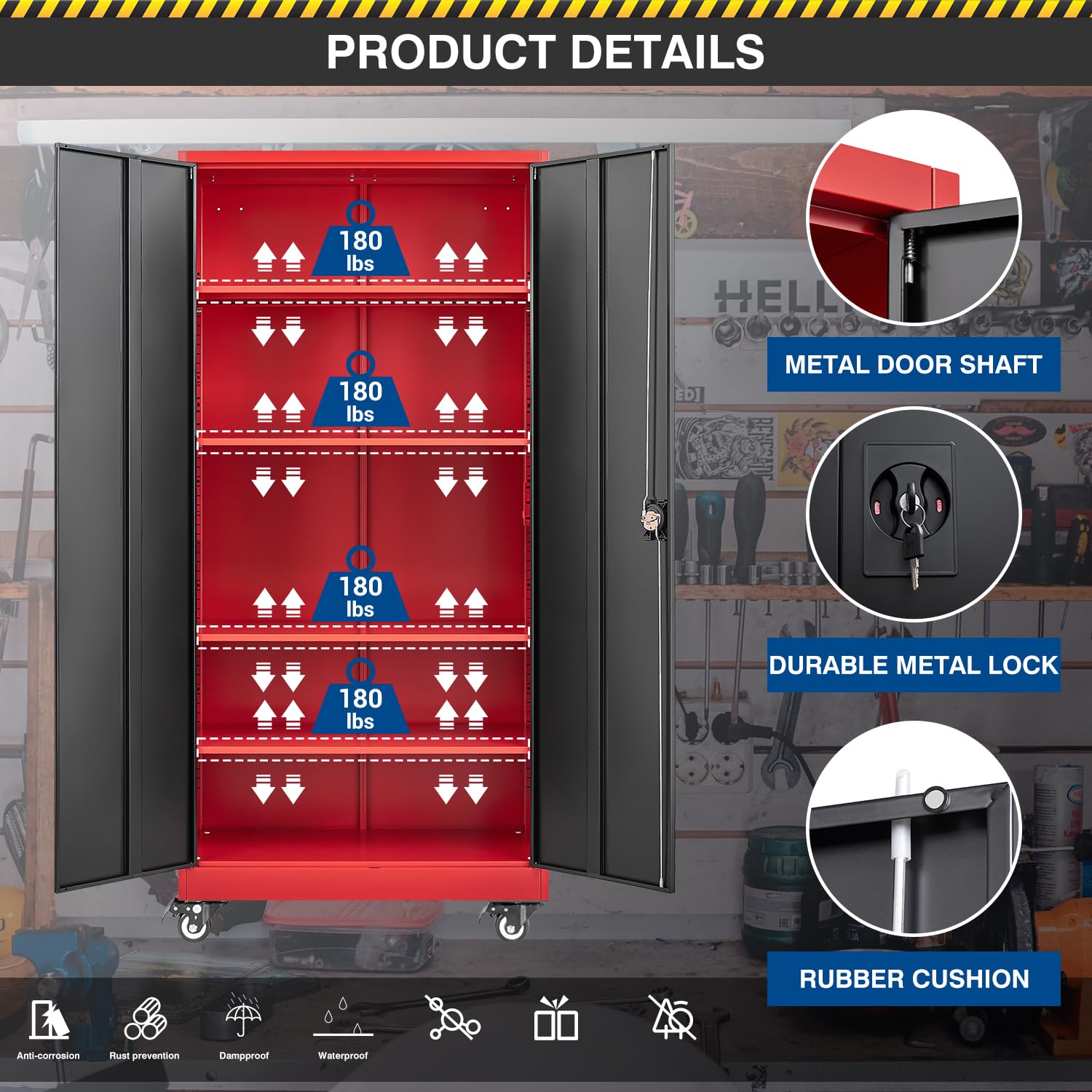 • Locking & Wheeled Storage Cabinet- The storage cabinet has 2 hinged doors, with full-length welded reinforcements to increase strength, Four metal bracket wheels (two of which have independent brakes) can bear more weight while also allowing the cabinet to be moved easily, and a three-point locking rotating handle to ensure safety. 2 keys included, which can be used by co-owners or as a backup in case of loss.