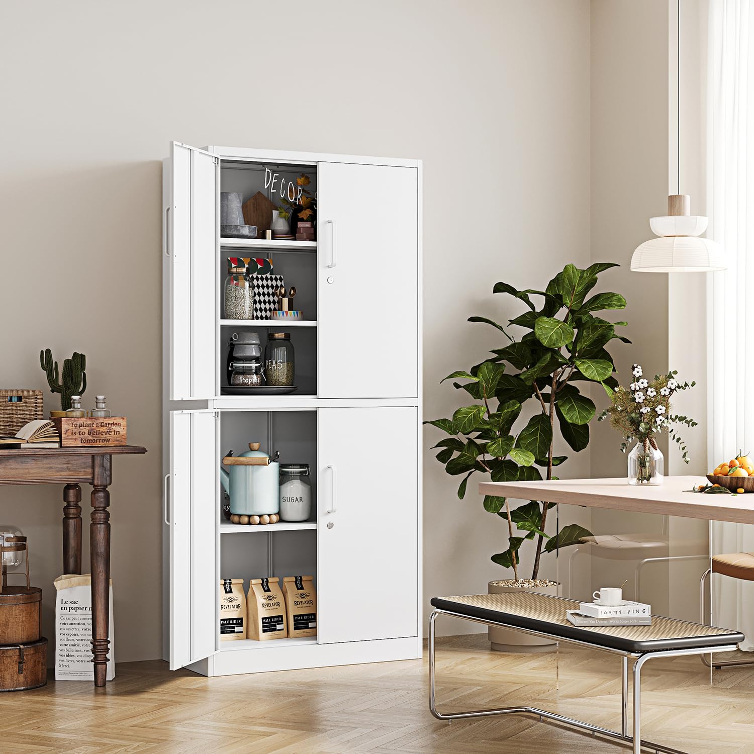 Fesbos White Pantry Cabinet and Organizers - 71”H Kitchen Metal Storage Cabinet with 4 Doors and 3 Adjustable Shelves for Kitchen, Living Room and Dinning Room