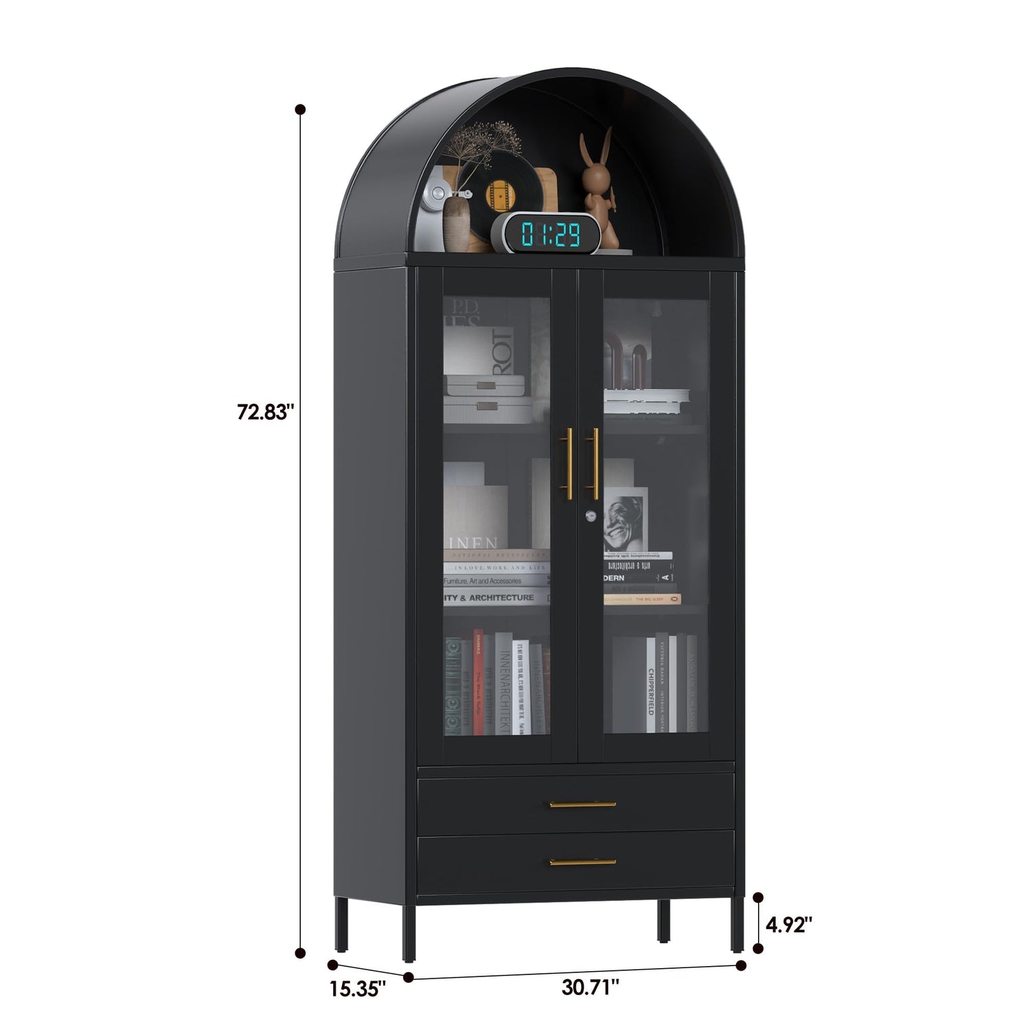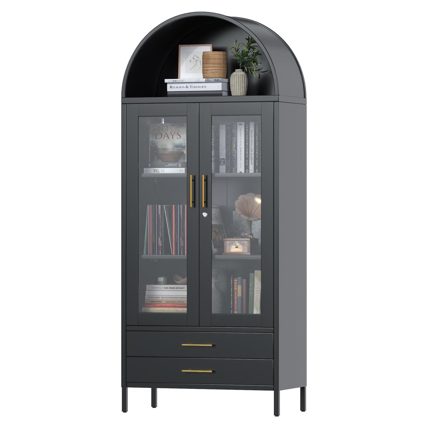 - Stylish Arch Design - The arched bookcase is a stunning combination of design and practicality. Its gracefully arched silhouette serves as a statement piece, adding modern elegance to your home office. With two glass doors that showcase your china or prized possessions, this tall arched cabinet is stylish and functional, making it a perfect addition to any room.