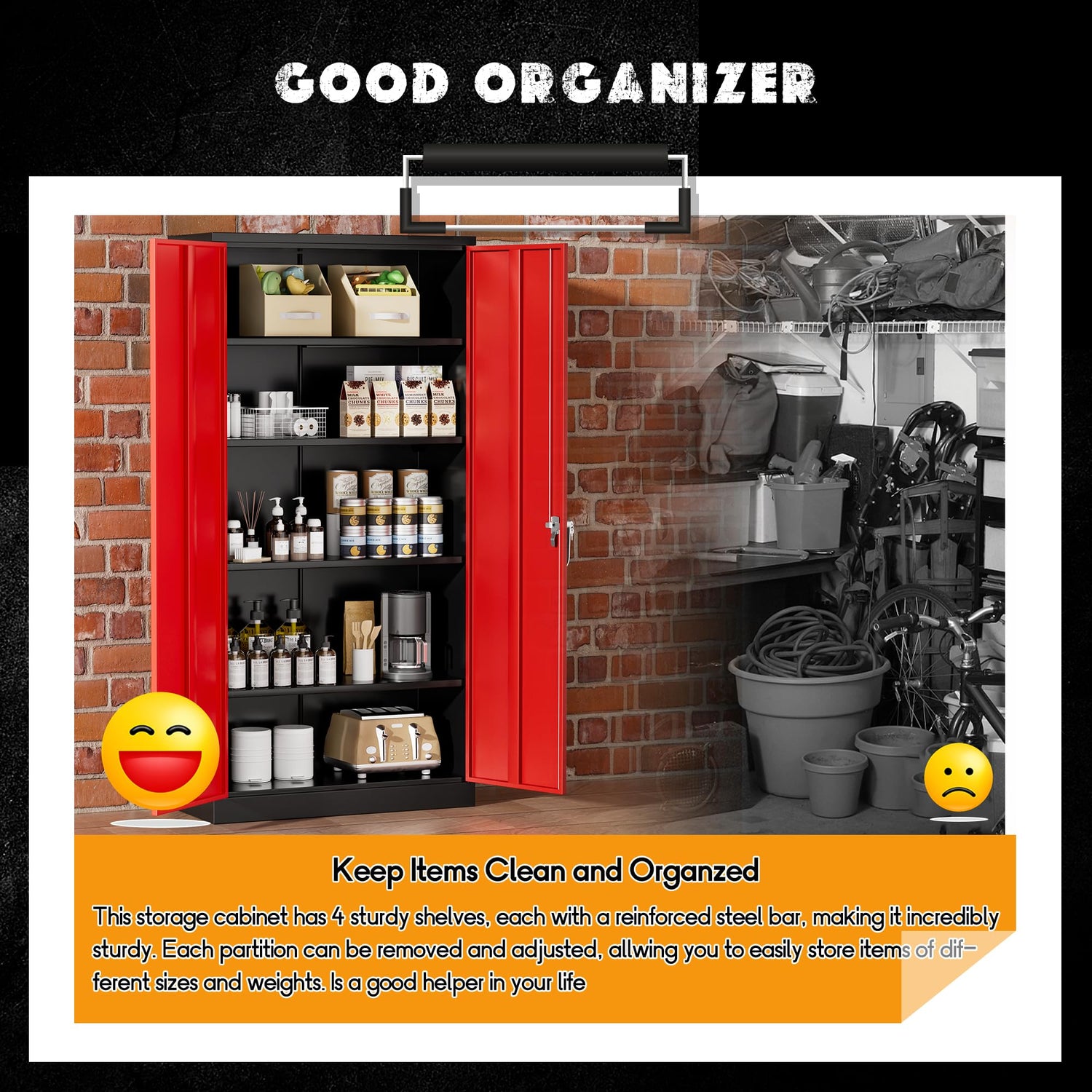 Greenvelly Metal Garage Storage Cabinet with Doors and Adjustable Shelves,72" Black Red Locking Steel Garage Cabinet,Storage Cabinet with Lock, Metal Tool Cabinets for Garage,Home Office,School