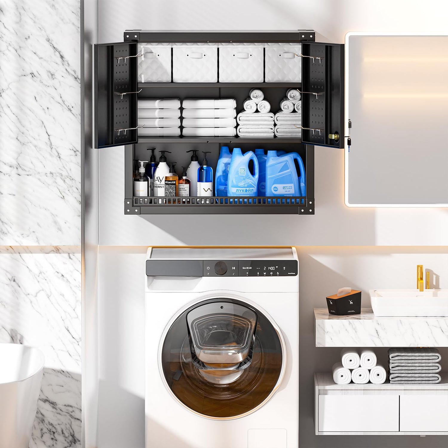 - 【High Quality Material】The wall cabinet storage(12"D x 32"W x 31"H) is made of 0.88mm thick cold rolled steel plate, each layer can firmly carry 120 lbs. The surface of the cabinet is coated with electrostatic powder coating technology, which gives it excellent anti-rust properties and makes cleaning and maintenance easy.For garages, offices, kitchens, and bathrooms, steel wall mounted storage cabinets are definitely one of the perfect choices for storage.