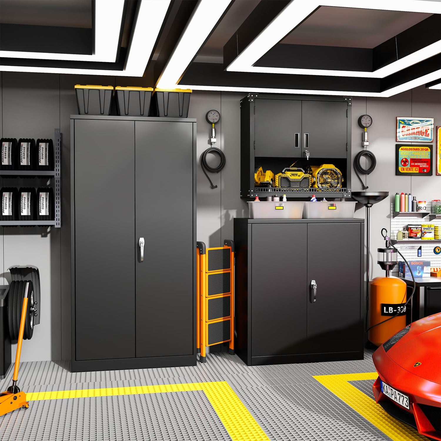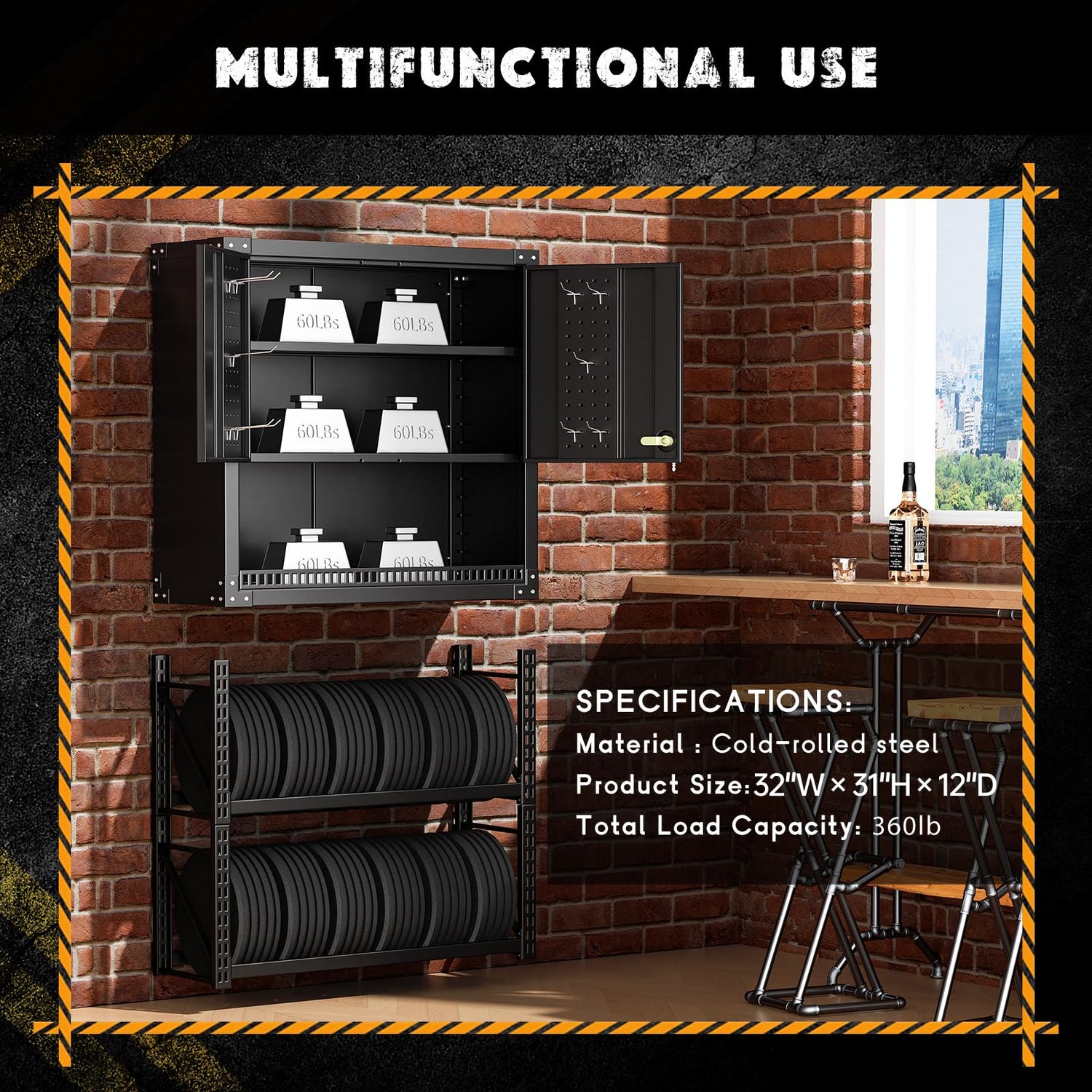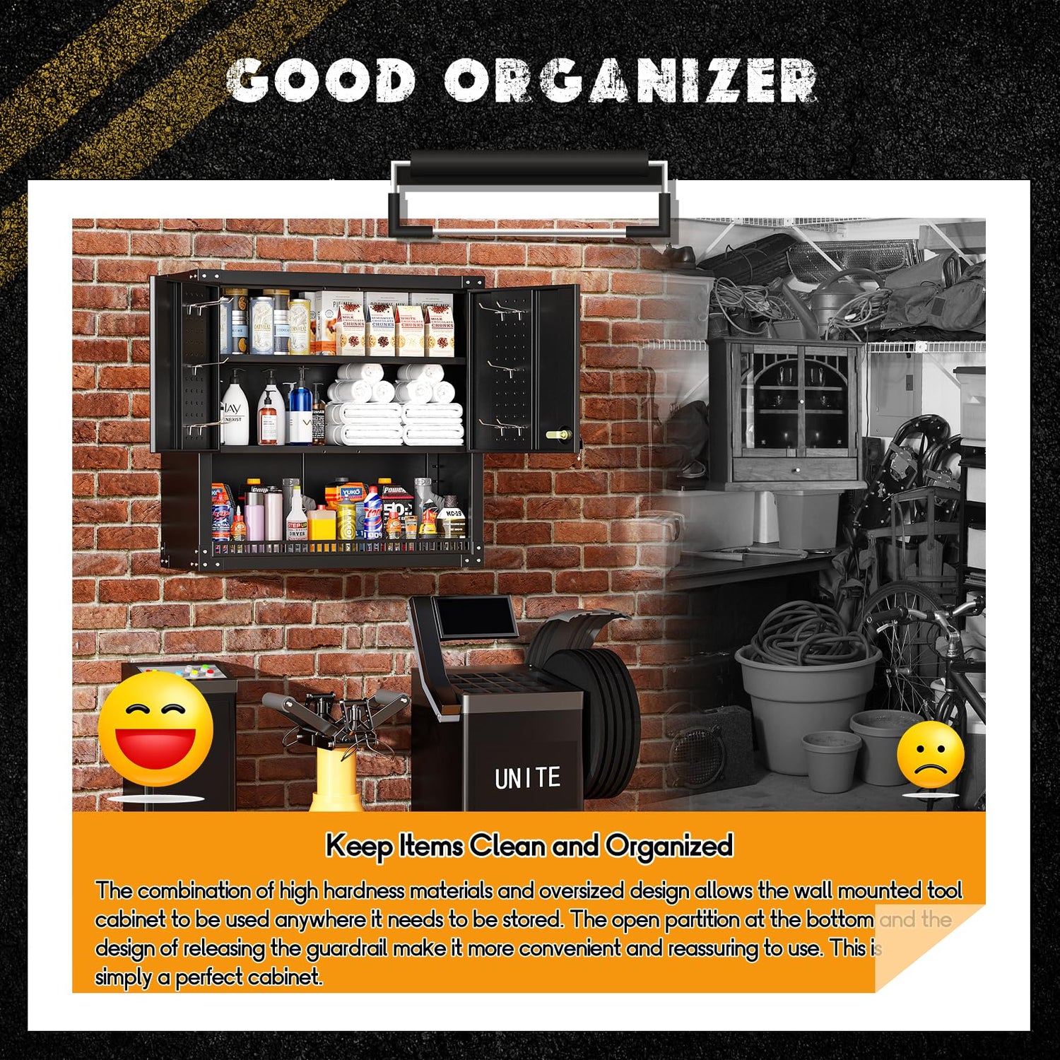 - 【Layered Storage Space】 The upper space of the metal garage storage cabinet is equipped with 2 doors with a locking function.Additionally, an open-tiered shelf with guardrails has been added to the bottom of the cabinet, providing a handy space for temporary storage where items can be easily accessed, enhancing your storage experience to perfection. With its exquisite design and humanized functions, this wall mounted cabinet brings great convenience to your home life.