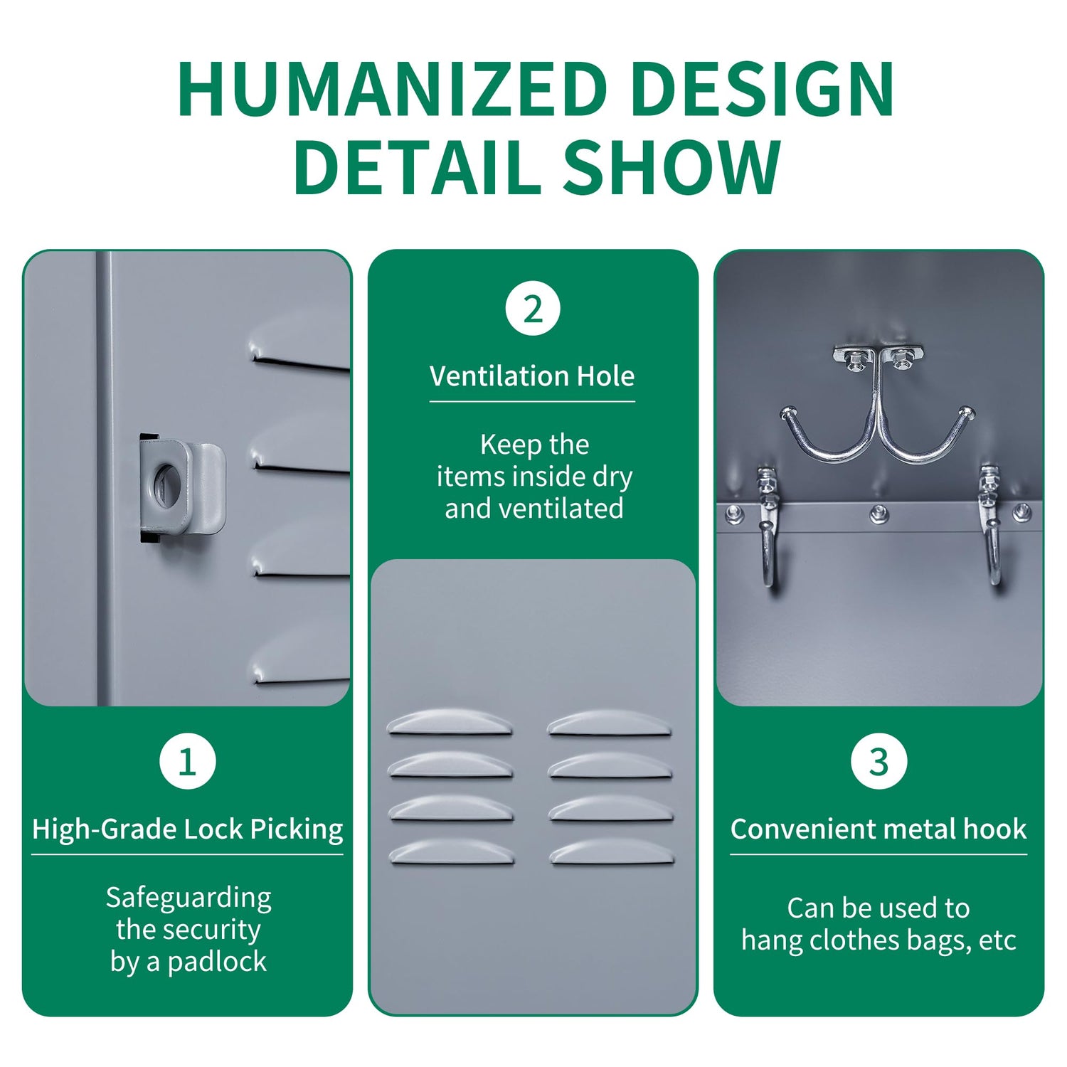- 【Thoughtful Design】:This employee locker is equipped with metal hooks for hanging your stuff conveniently.The steel doors feature discreet ventilation holes which keep your items dry and odor-free while maintaining your privacy.the tall legs ensure the cabinet doesn't touch the ground,moisture-proof meanwhile easy to clean.
