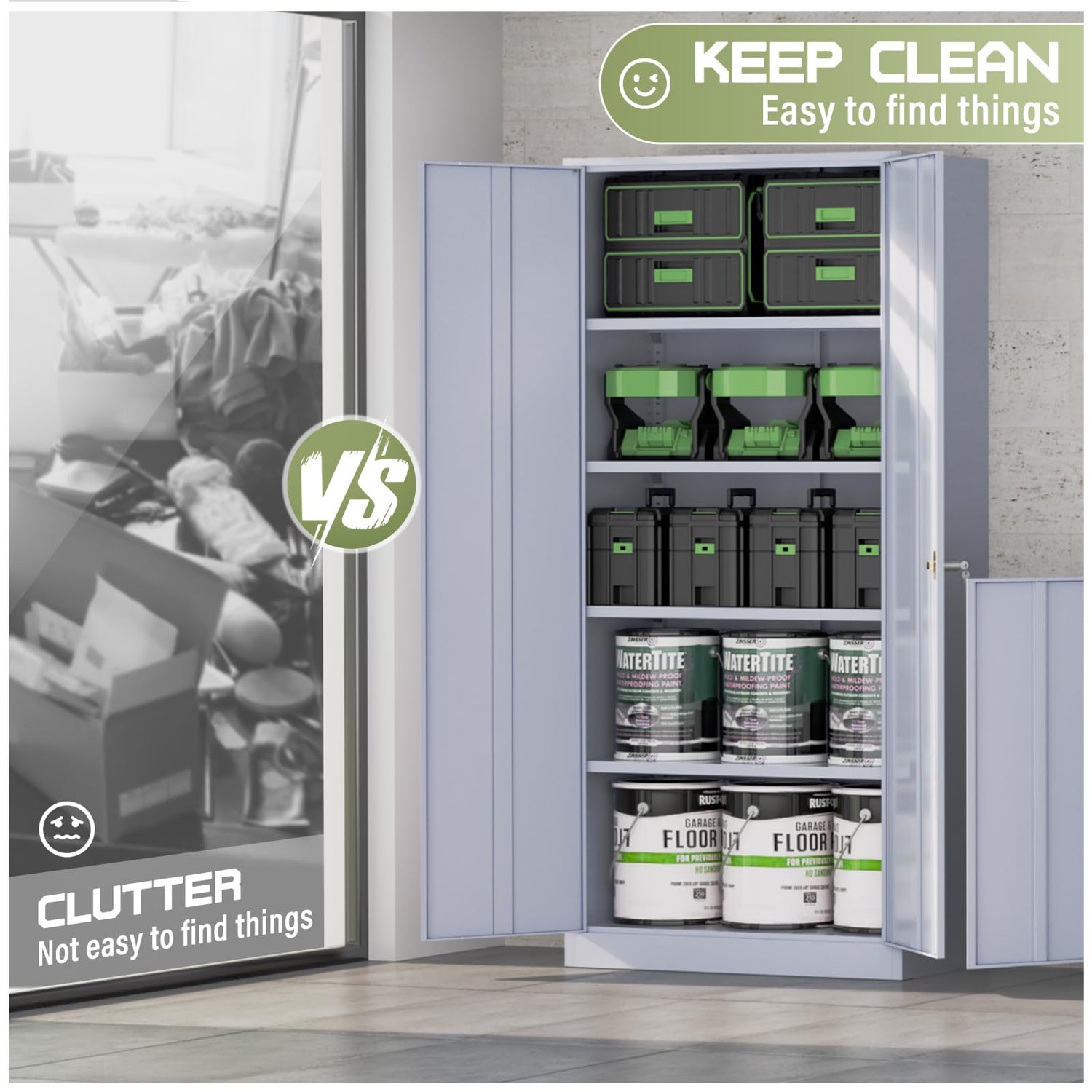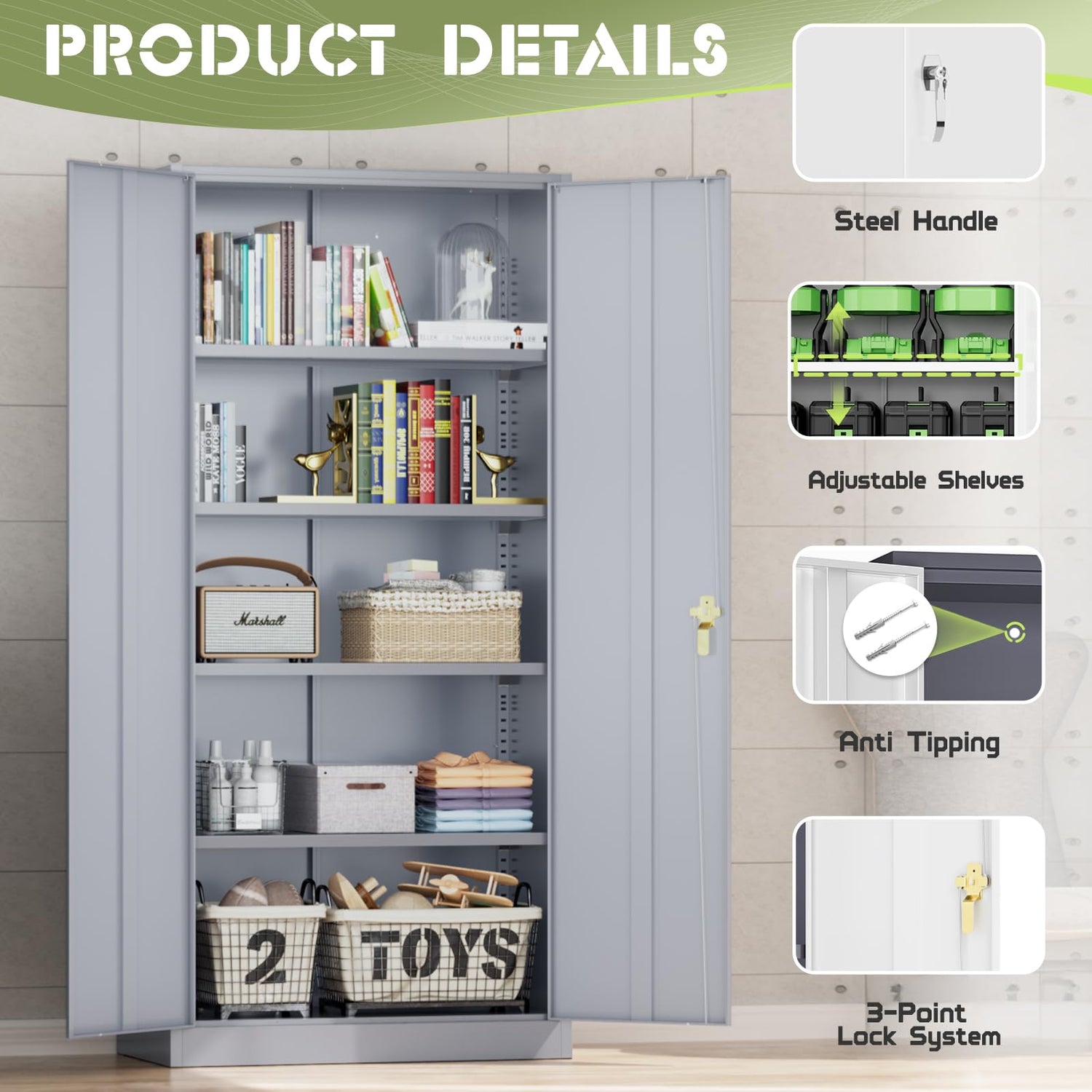 Incbruce 72” Metal Storage Cabinet, Tall Locking Steel Storage Cabinet with 2 Doors and 4 Adjustable Shelves,Lockable Storage Cabinet for Home, Office, Warehouse(Grey)