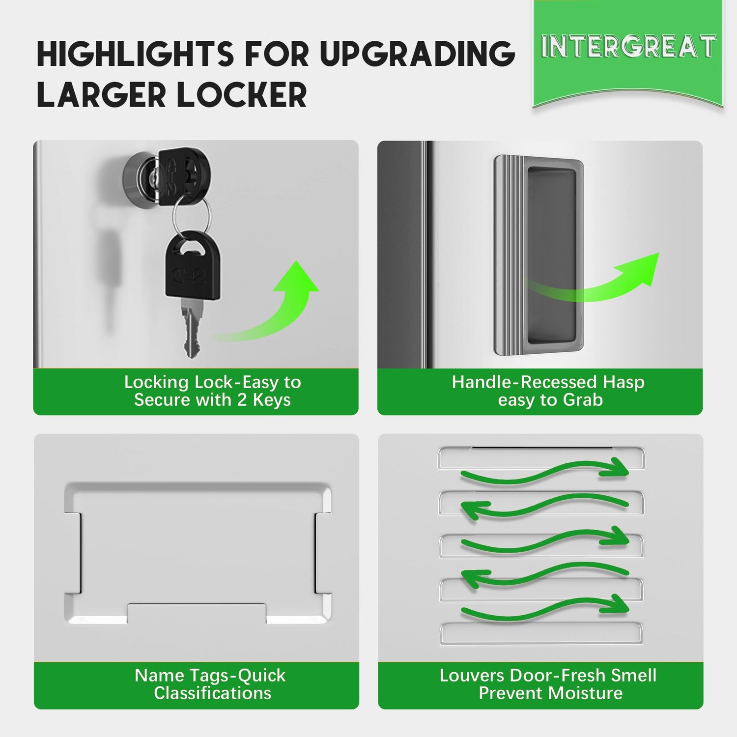 - [Excellent Security]:INTERGREAT storage locker cabinet equip with 4 lock blocks with 2 keys(each lock block) and handles design to keep your property safe and bring convince to use it.Meanwhile our metal locker cabinet products are equipped with anti-tipping devices to keep your security.Locker storage cabinet can easily blend with many places, such as home, gym, school, porch, office, classroom,etc.
