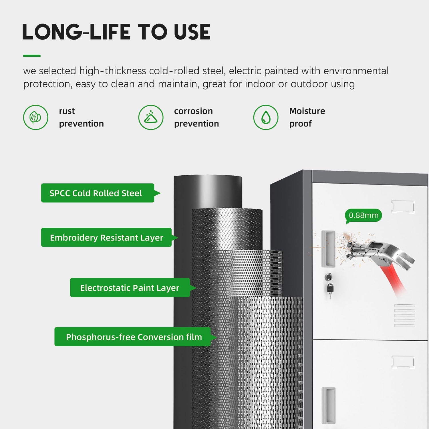 - [Excellent Material ]:INTERGREAT specializing in metal storage lockers market for many years .This metal lockers for employees is made up of 0.88mm cold-rolled steel plate.Each shelf load capacity up to 120 lbs.We also use an advanced coating process on the surface of the steel plate,which make it rust and corrosion prevention and suitable for a variety of wet and dry environments.
