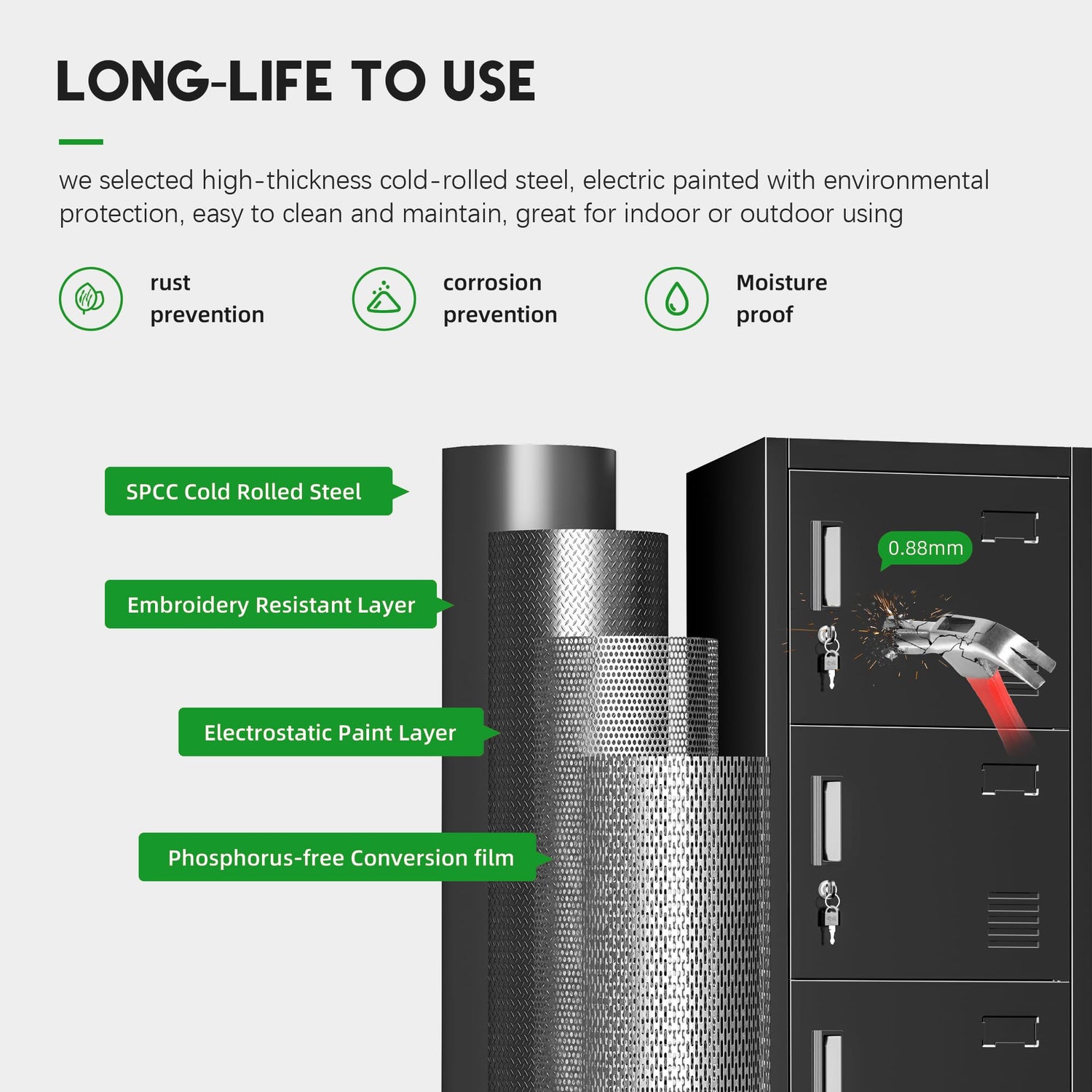 - [Excellent Material ]:INTERGREAT specializing in metal storage lockers market for many years .This metal lockers for employees is made up of 0.88mm cold-rolled steel plate.Each shelf load capacity up to 120 lbs.We also use an advanced coating process on the surface of the steel plate,which make it rust and corrosion prevention and suitable for a variety of wet and dry environments.