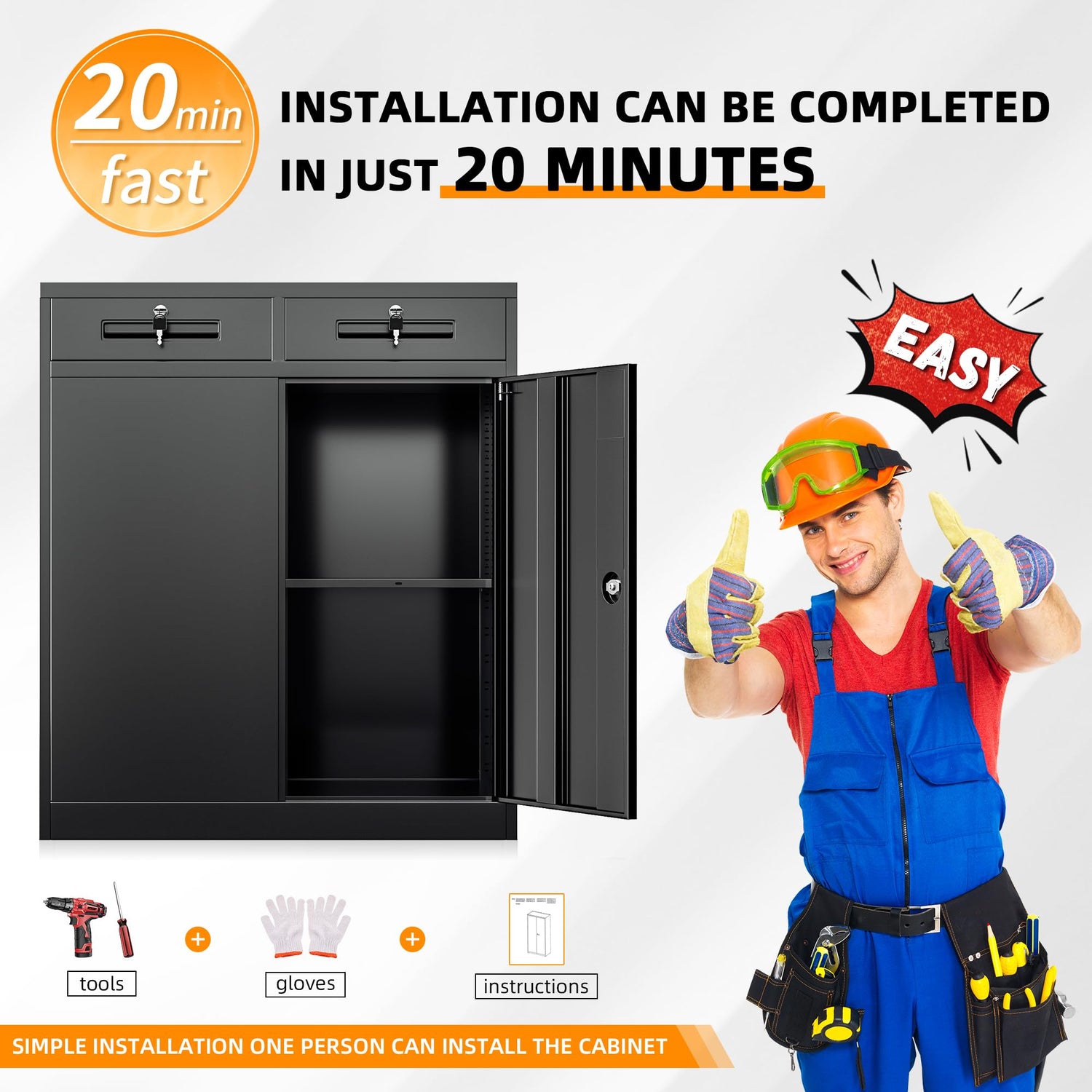 INTERGREAT Metal Storage Cabinet with 2 Drawers, 42β Black Steel Garage Storage Cabinet with 2 Doors and Adjustable Shelves, Office Storage Cabinet with Lock for School, Home