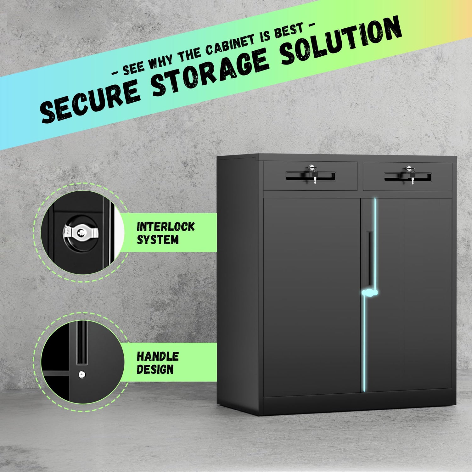- 【Lots of storage space】The size of the middle 2 drawer filing cabinet is 18"D x 36"W x 42"H.The oversized black storage cabinet with drawers has two drawers and a large cabinet space, the drawer can be used to store some small items such as stationery, sticky notes, etc.Lockable metal filing cabinets can hold larger documents, folders, or file boxes, giving your office space a neater and more organized look.