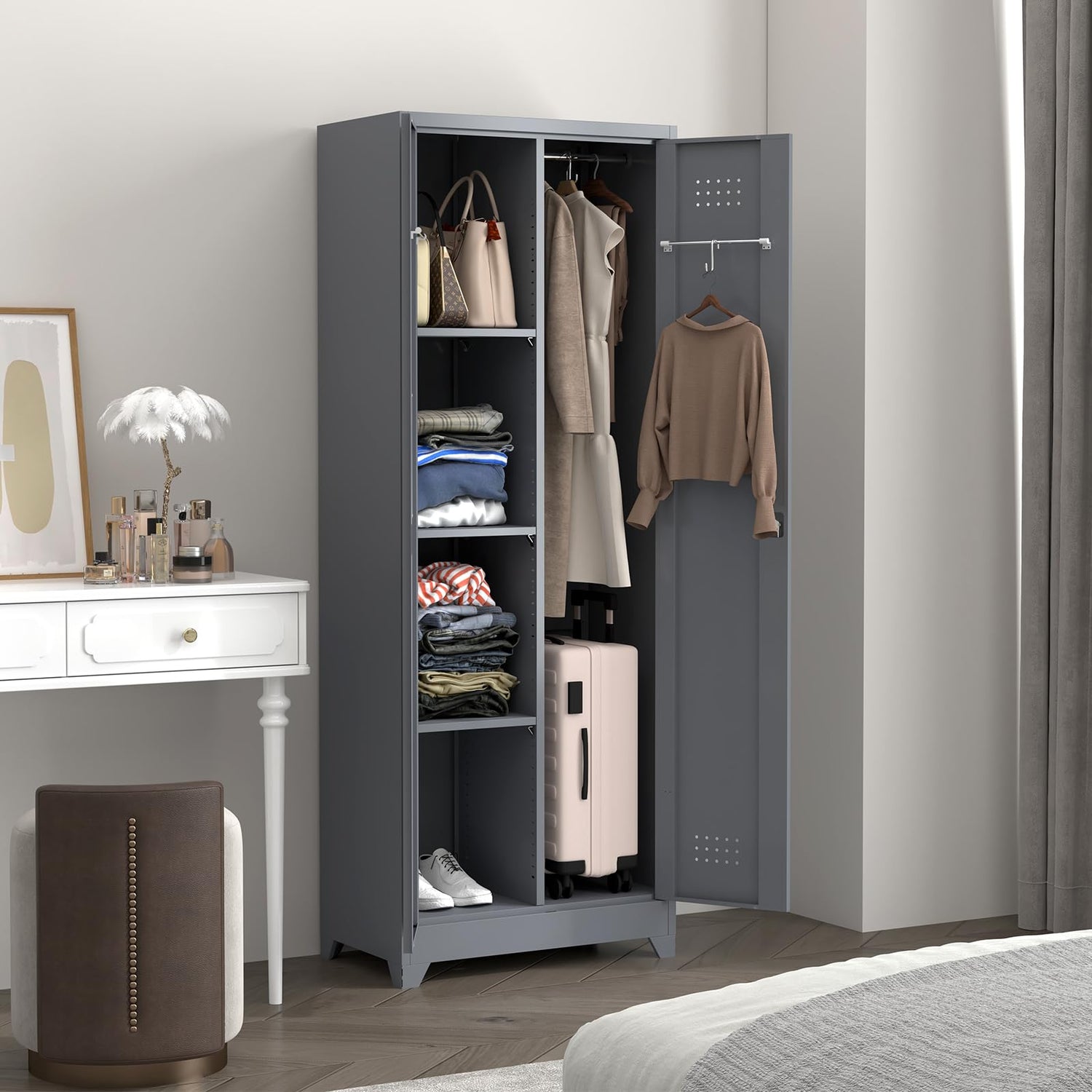 - 【MULTI-PURPOSE】The metal storage cabinet can store different items such as mops, brooms, fishing rods, towels, clothes, documents,etc. and can be used in garages, homes, warehouses, laundries,or anywhere you need a secure storage space.