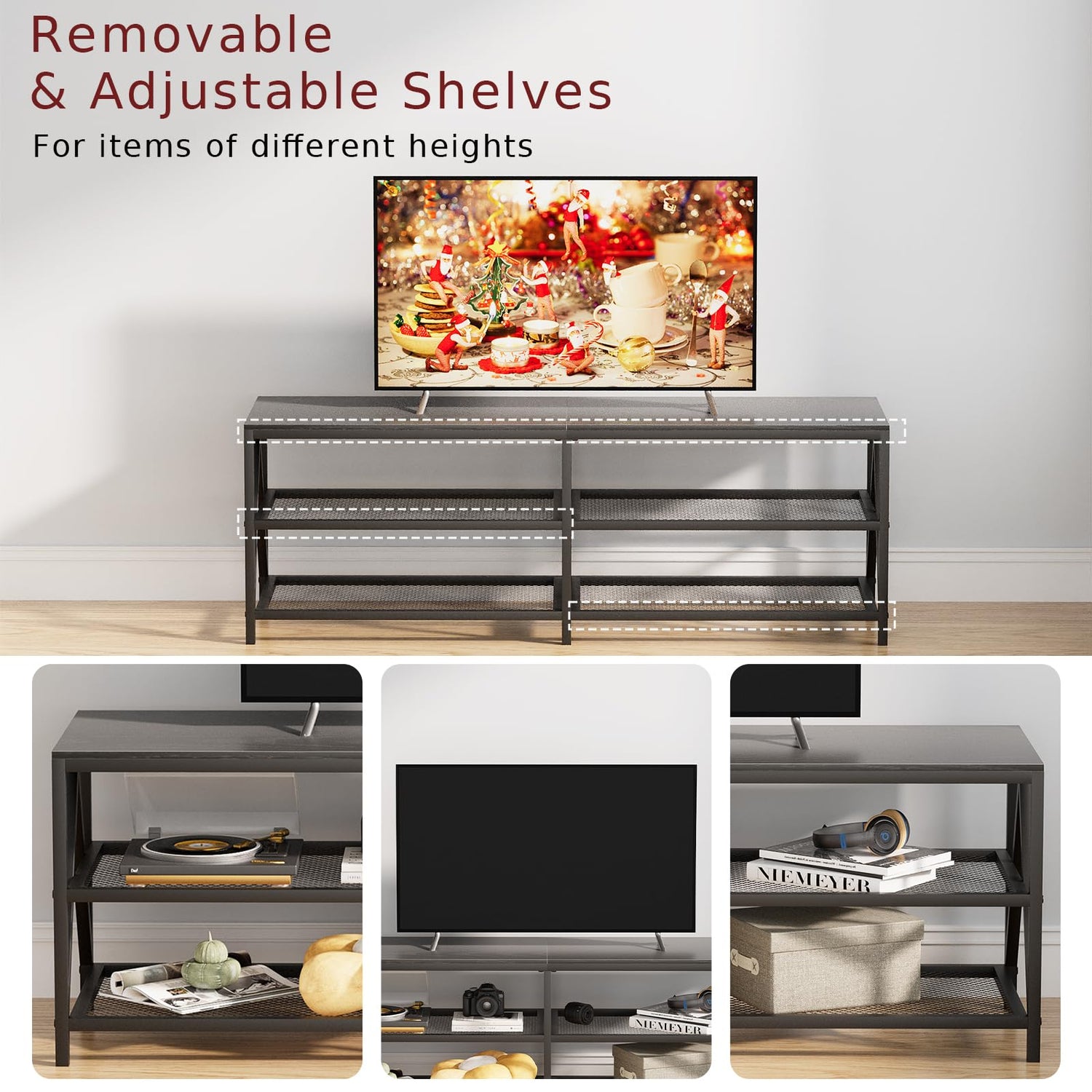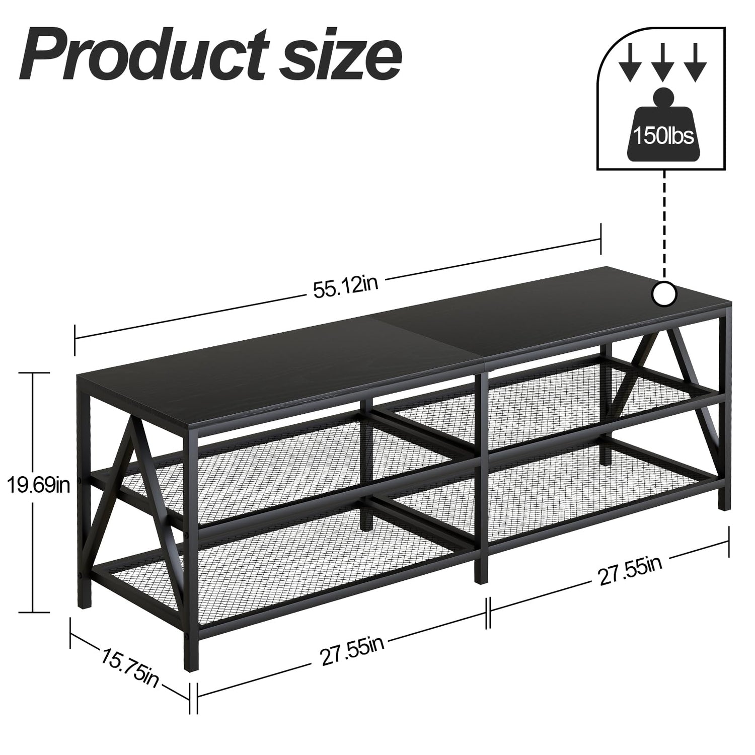 - The size of the TV stand is 55.12*15.75*19.69'' /140*40*50(L*W*H CM) . Suitable for TVs from 32-65 inches. And the weight capacity is 150 pounds. Two levels of storage open space can be placed more items, and the grid design helps to ventilate and dissipate heat from overheated electronics such as cases and stereos. The single tier height is 9.85'' in, so you don't have to worry about overheating in tight spaces.