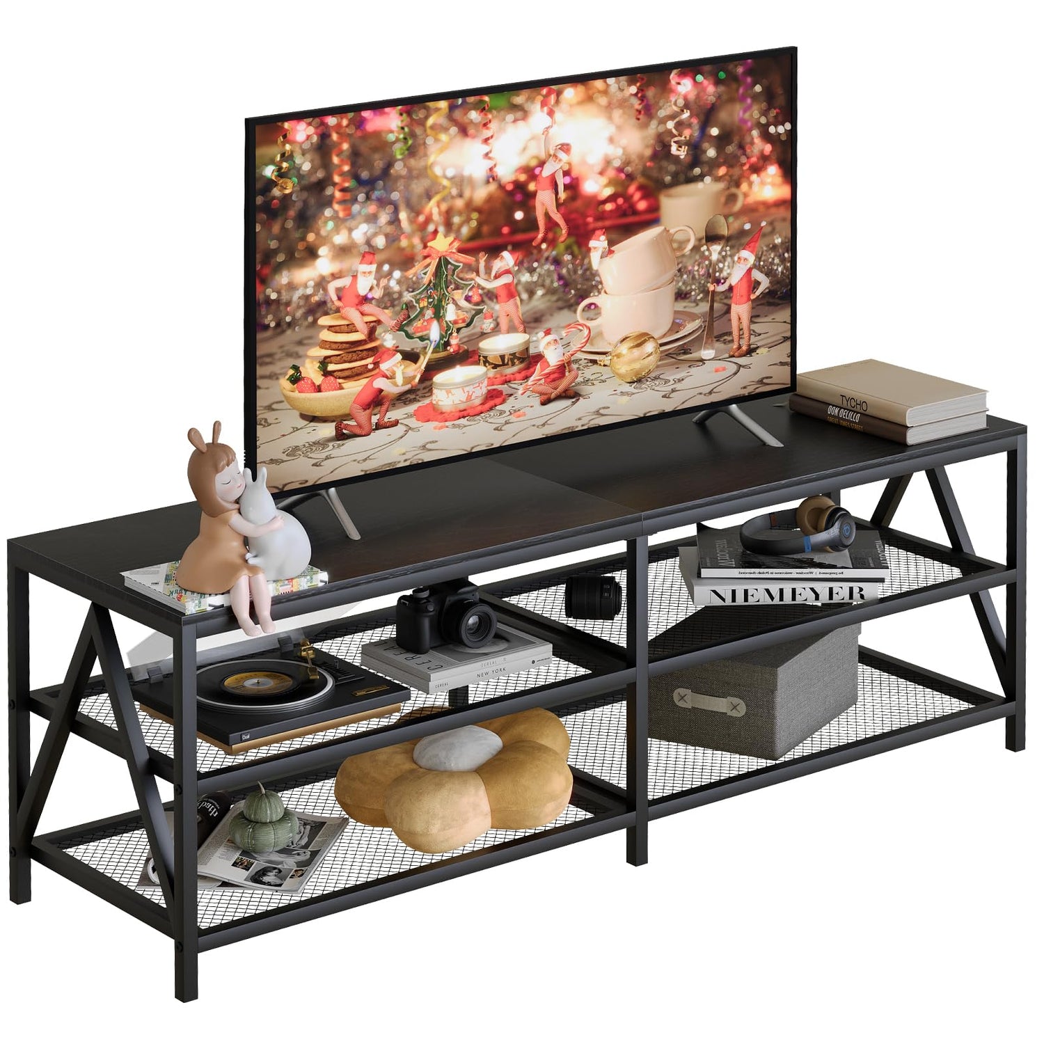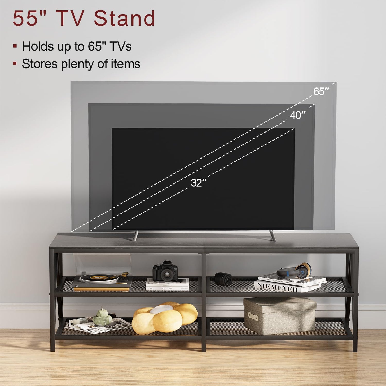 Katrawu TV Stand for TV up to 65 Inch, Long 55" TV Cabinet with 3-Tier Storage Shelves,Entertainment Center TV Console Table for Living Room with Industrial TV Metal Frame, Black Oak