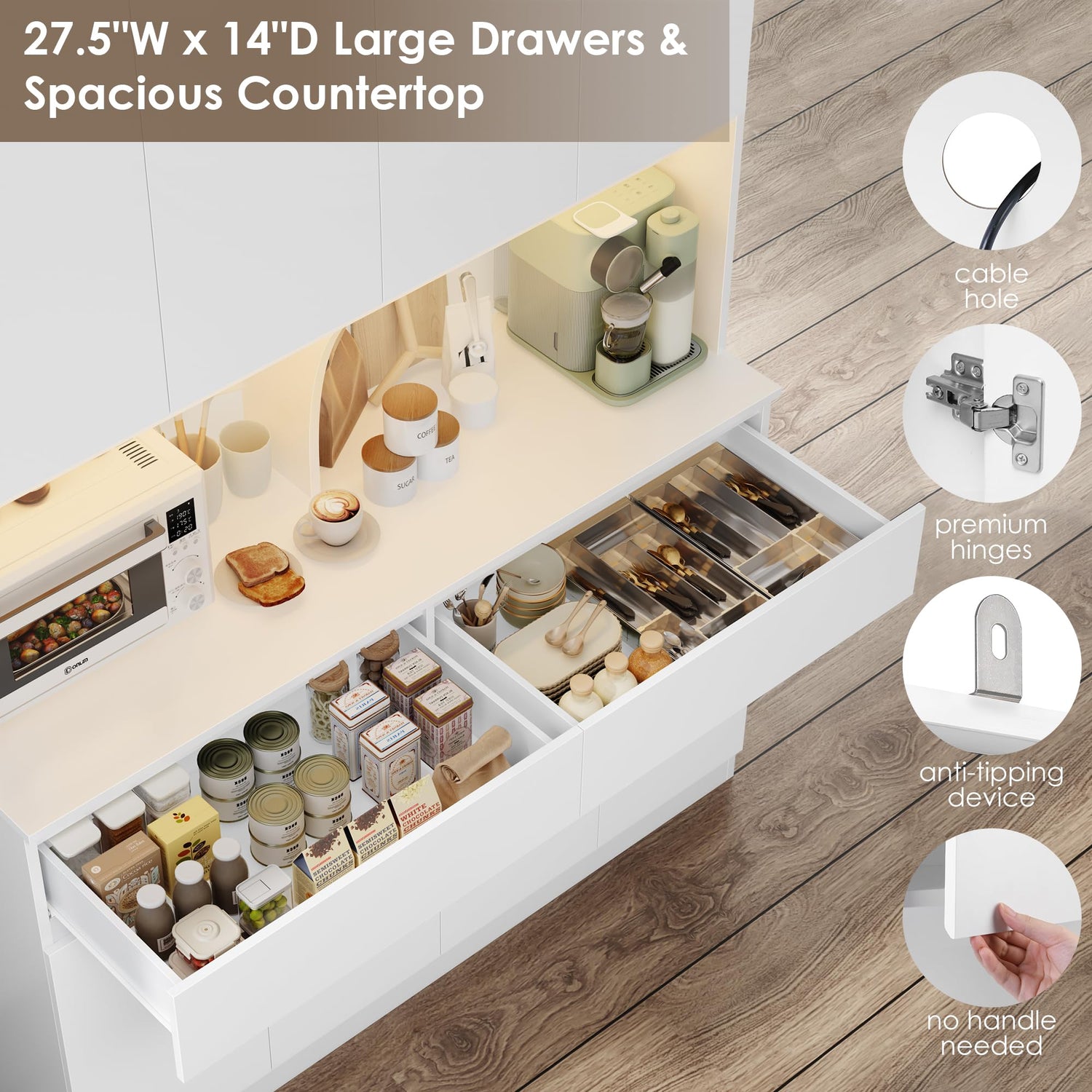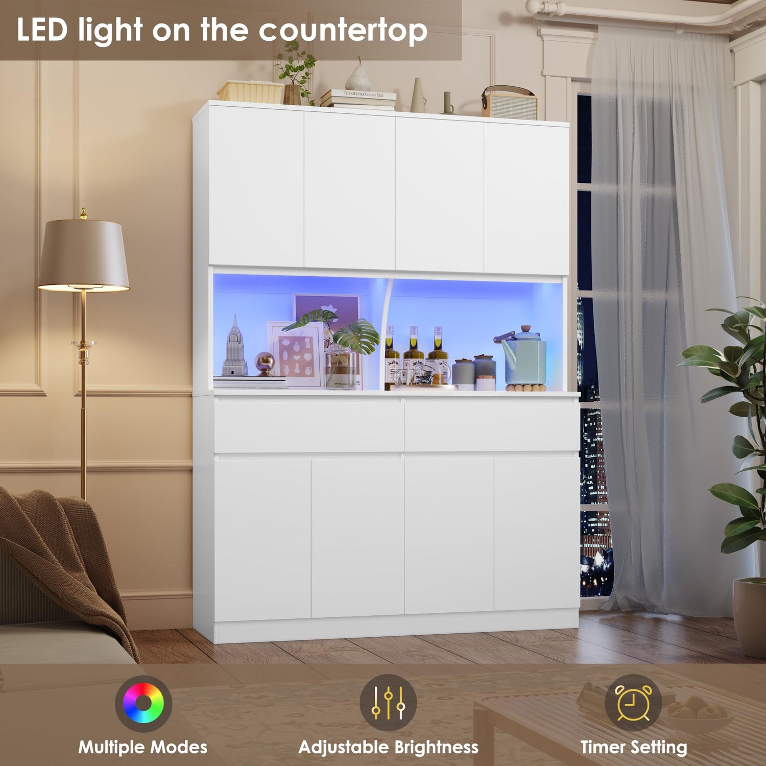 Large Hutch 75"H x 55"W Tall Kitchen Pantry with Doors and Drawers, LED Light Countertop Coffee Bar Buffet Adjustable Shelves in Storage Cabinet, Modern Freestanding Food Pantry Cupboard, White