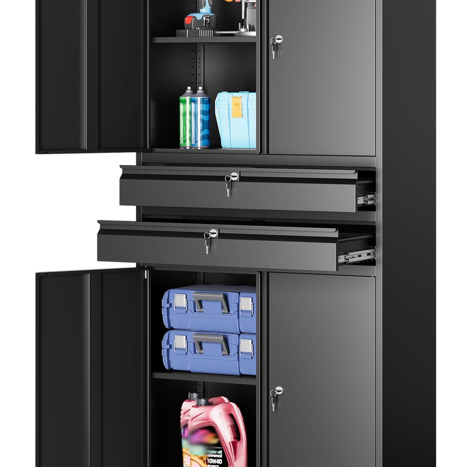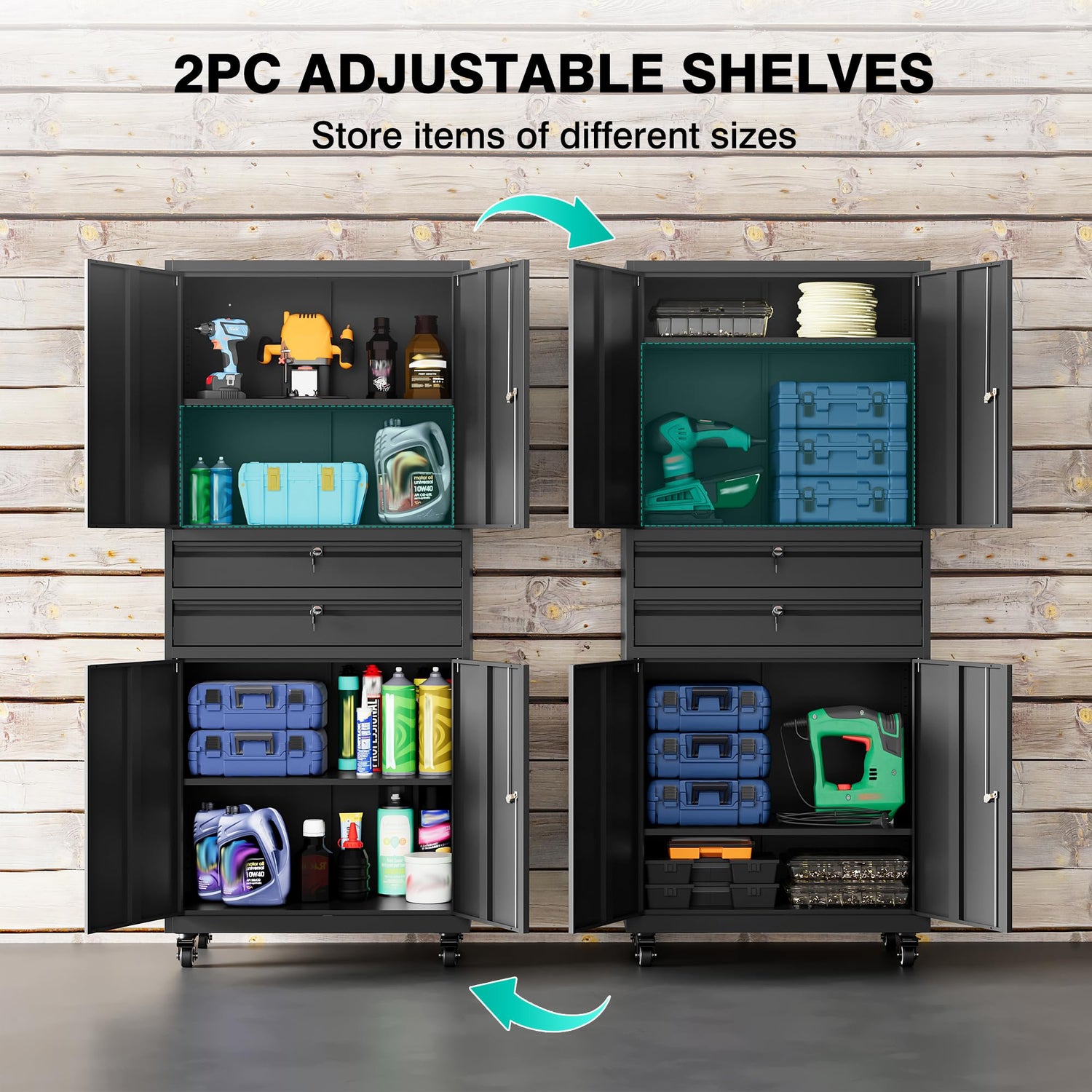 - VERSATILE STORAGE: 73-inch tall mobile metal cabinet storage with 2 adjustable shelves and 2 drawers, perfect for organizing tools, supplies, and equipment in garage, office, kitchen, or living room