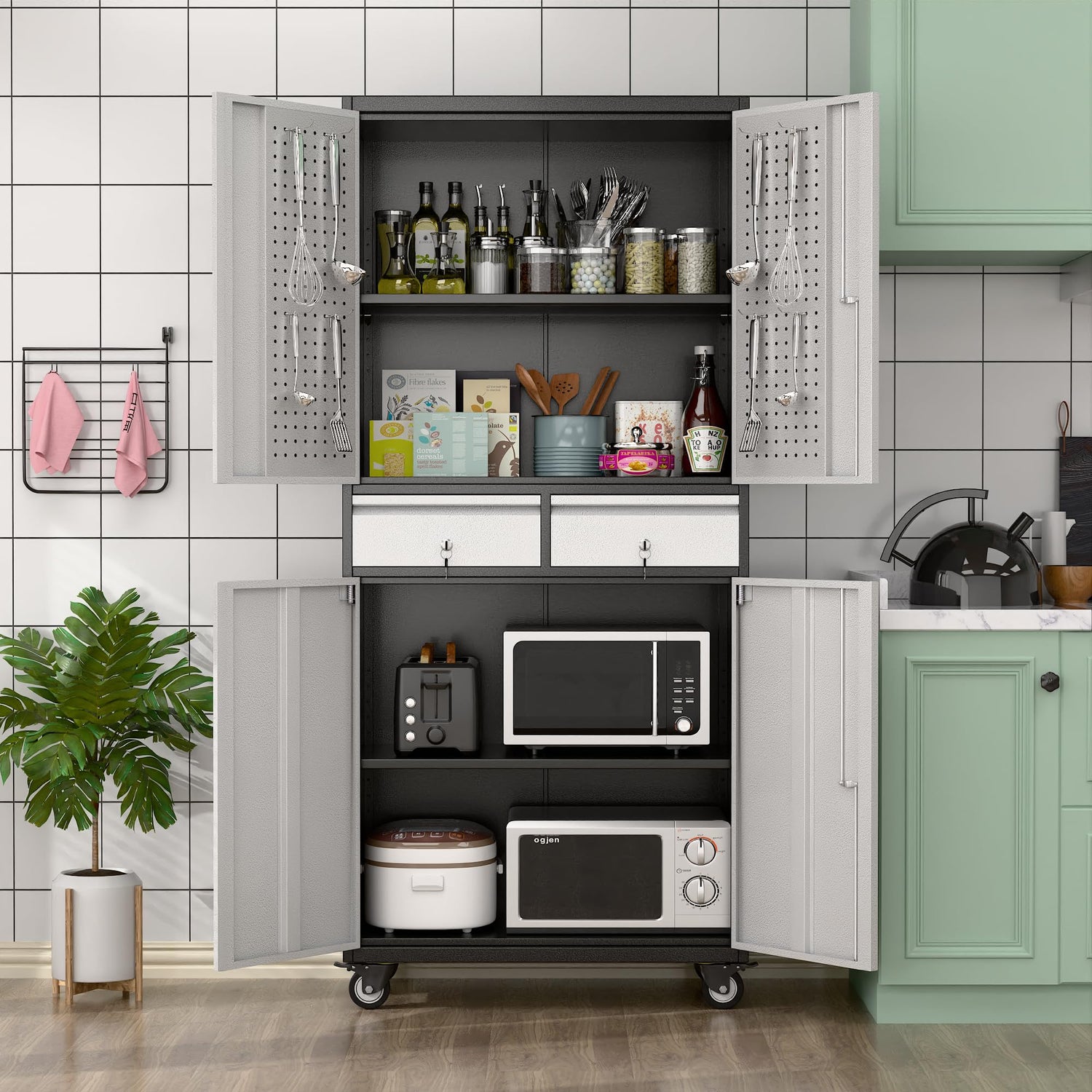 METALYEYE 71''H Metal Storage Cabinet with Wheels & Pegboard,Rolling Lockable Tool Cabinet with Adjustable Shelves & 2 Drawer for Garage,Offices,Homes,Pantries Assembly Required
