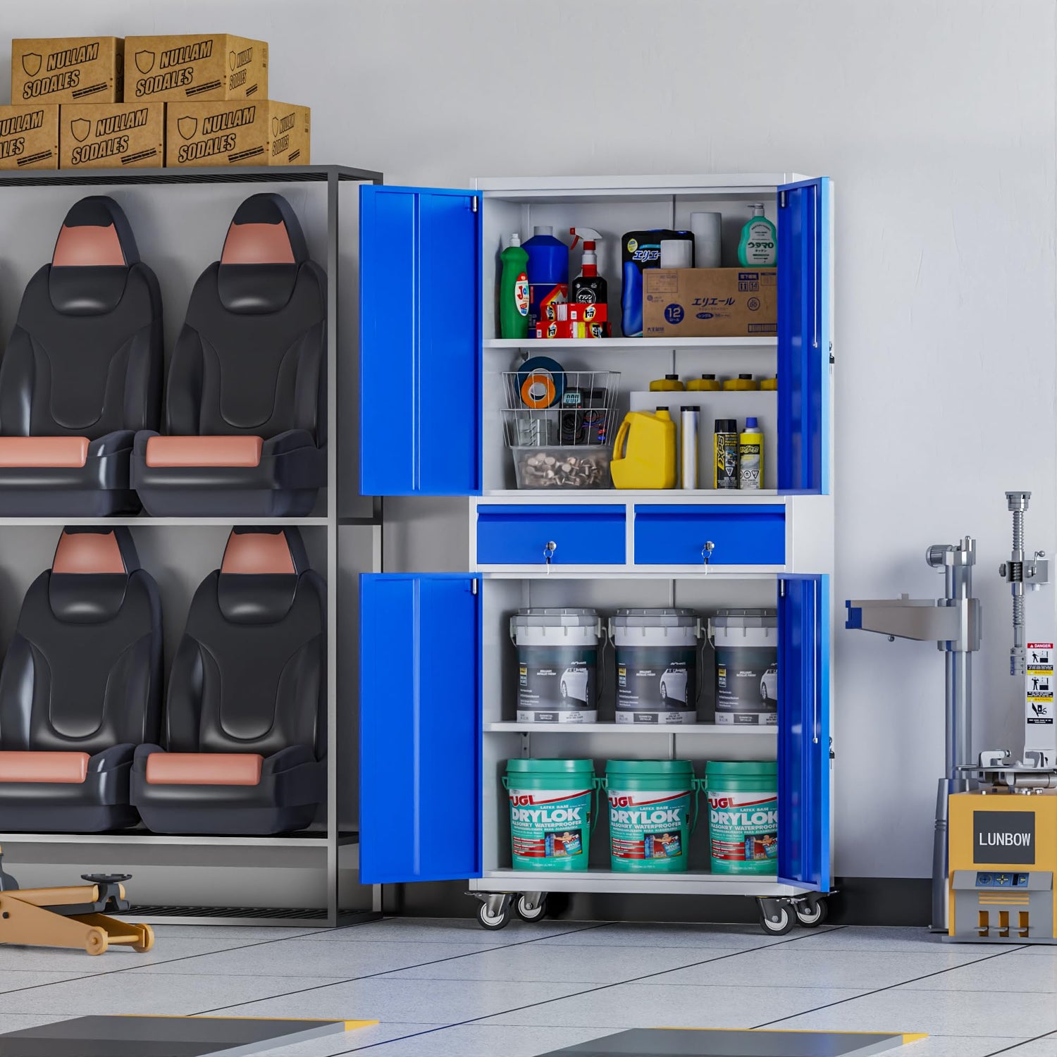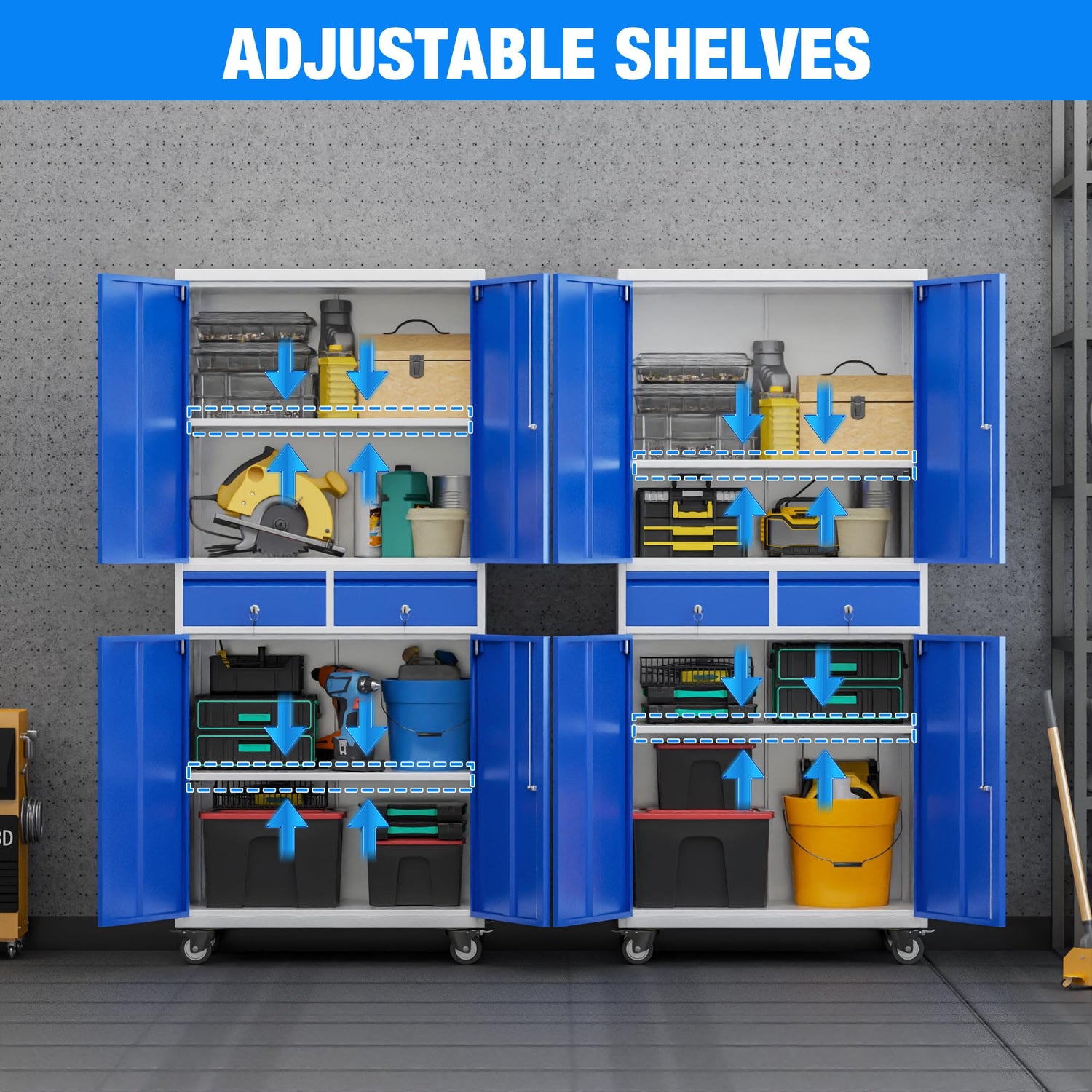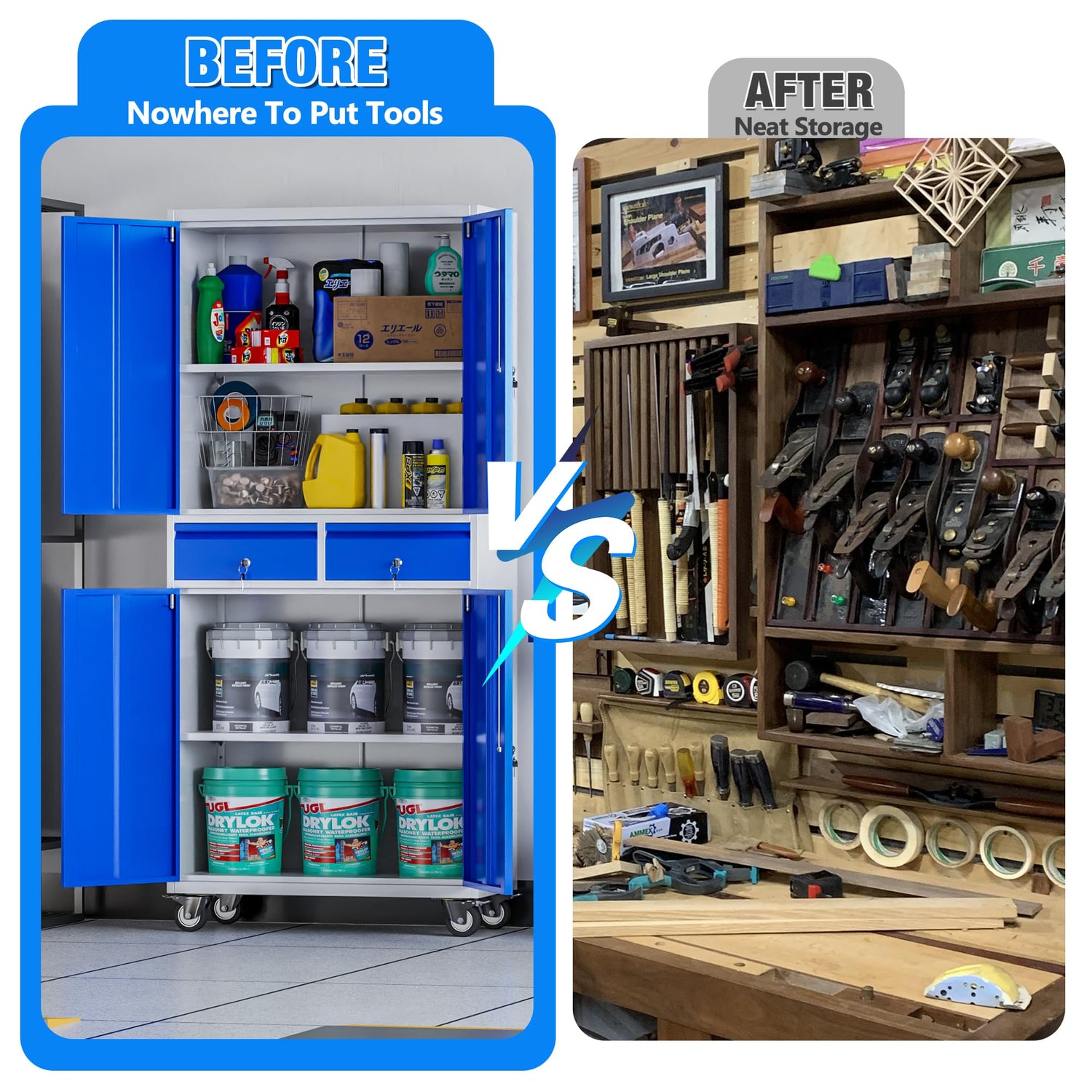 - 【2 Adjustable Shelves】 Locking cabinet on wheels has 2 adjustable shelves. The shelves can be adjusted up and down to the desired position for your household items, tools, and other items. 71" tall metal cabinet also has an interior design that adds extra space to any room.