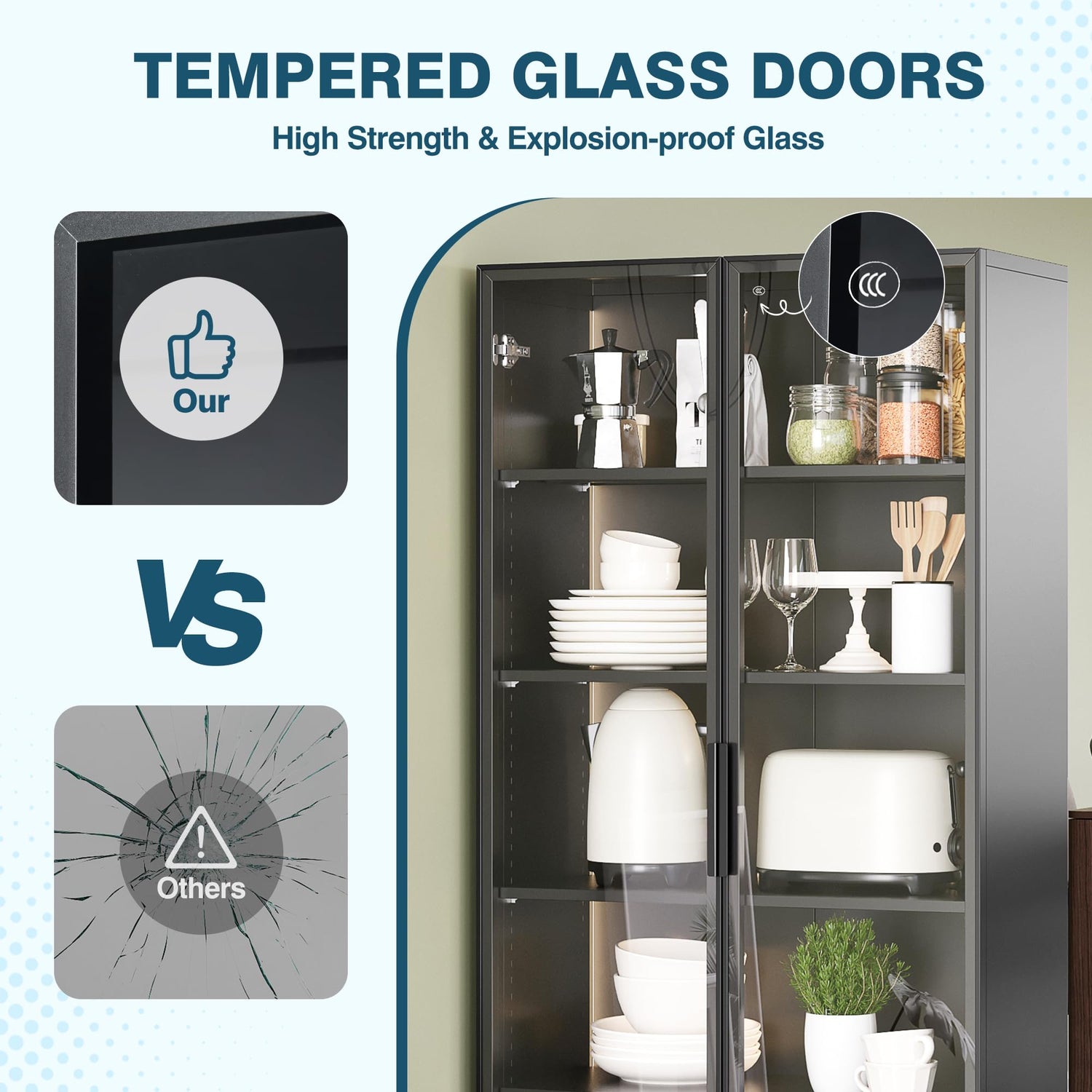 MIIIKO 63" Grey Glass Door Display Cabinet with 5 Shelves for Curios and Collectibles