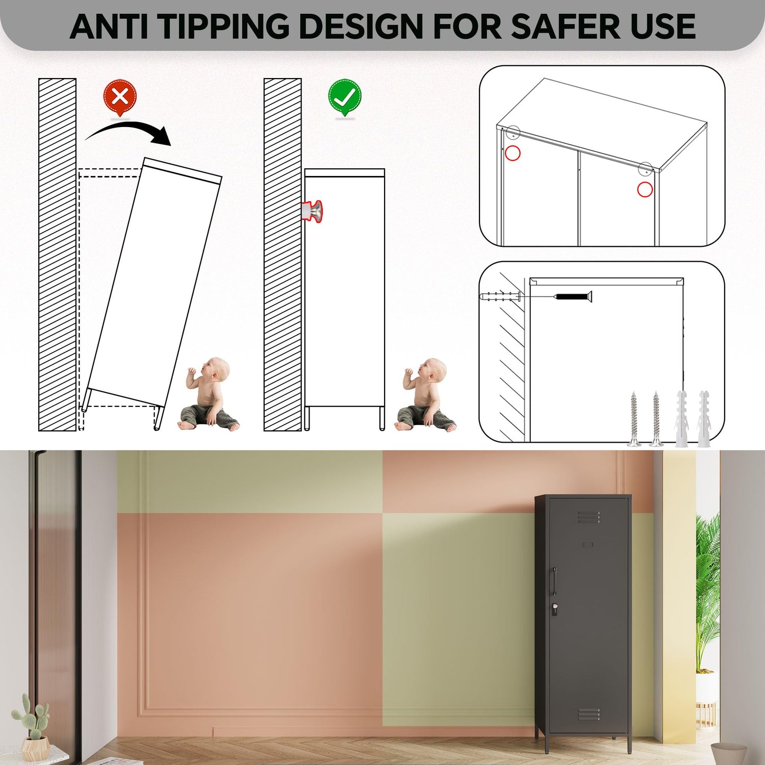 - ALL STEEL STRUCTURE: This metal storage locker is made of the steel through exquisite craftsmanship. The whole frame has been reinforced with additional steel bars, including the door. The special coating make the cabinet scratch and rust-resistant, durable and available for years. This furniture must be fixed to the wall with the enclosed wall fastener.