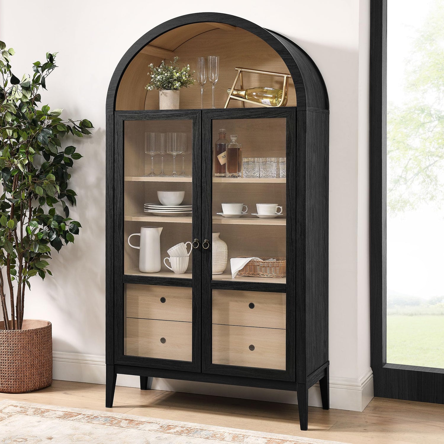 Modway Nolan Tall Arched Storage Display Cabinet in Black Oak - 74 Inch Arch Bookshelf with Glass Doors, Shelves and Drawers - Modern Accent Cabinet for Living Room, Dining Room
