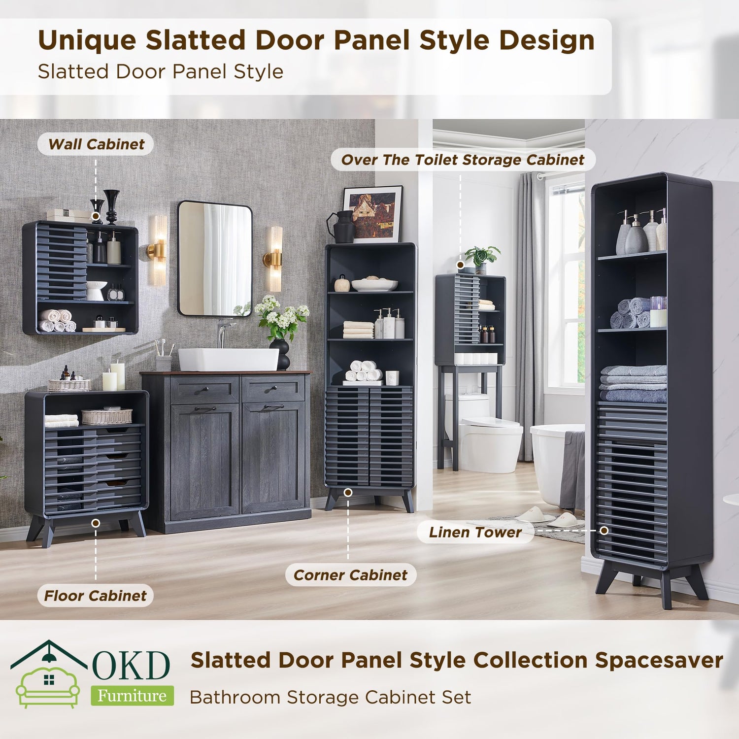OKD 68" Tall Bathroom Storage Cabinet, Mid-Century Linen Tower with Drawer, Adjustable Shelf, Slatted Hinged Door, Curved Edges, Space-Saving Organizer for Bathroom, Kitchen, Living Room - Dark Grey