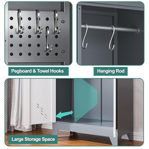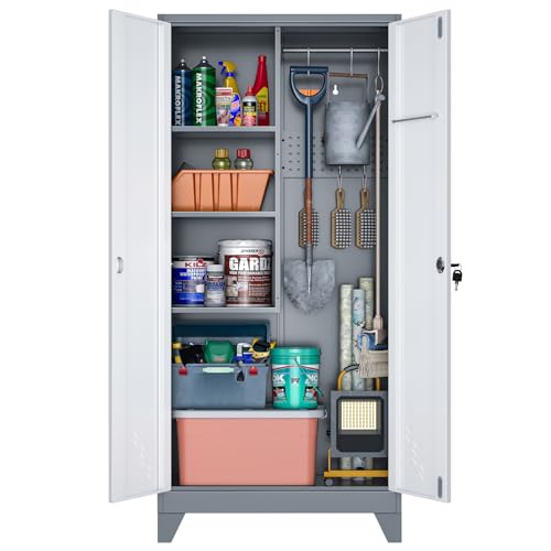 - 【Spacious Storage】-Our Metal Storage Cabinet with Locking Doors provides ample room for a variety of items with its three shelves and hanging rod. Whether you need a garage storage cabinet, tool cabinet, bathroom cabinet, laundry cabinet, ski cabinet, snowboard cabinet, utility cabinet, or cleaning supply storage cabinet, this versatile storage solution has you covered. With more vertical space than other products, you can store sundries, mops, fishing rods, snowboards, and other miscellaneous items conveniently