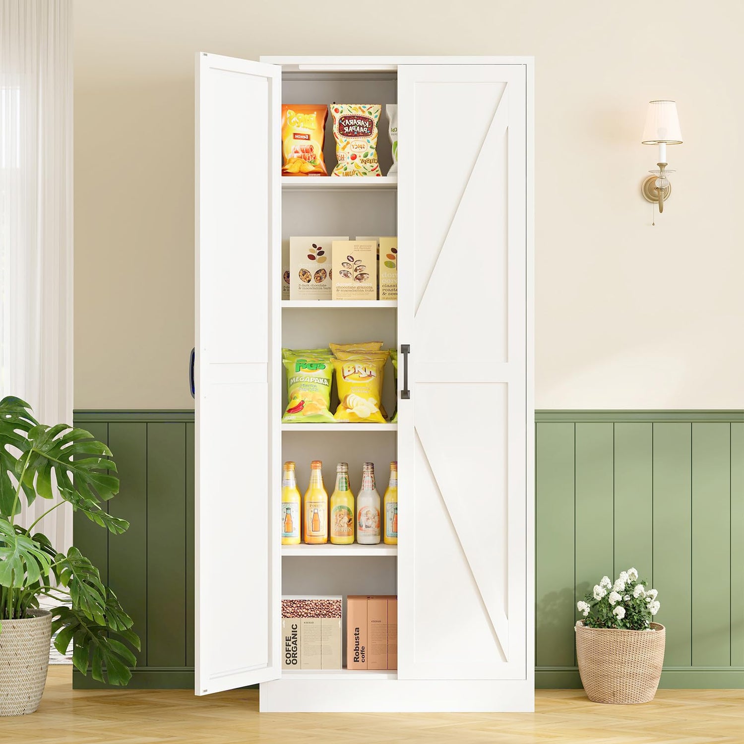 RAVIGIN Farmhouse Storage Cabinet,75" H Metal Pantry Cabinet with Barn Doors and Adjustable Shelves,75" H 6-Tier Rustic Pantry Organizers for Kitchen,Dining Room,White