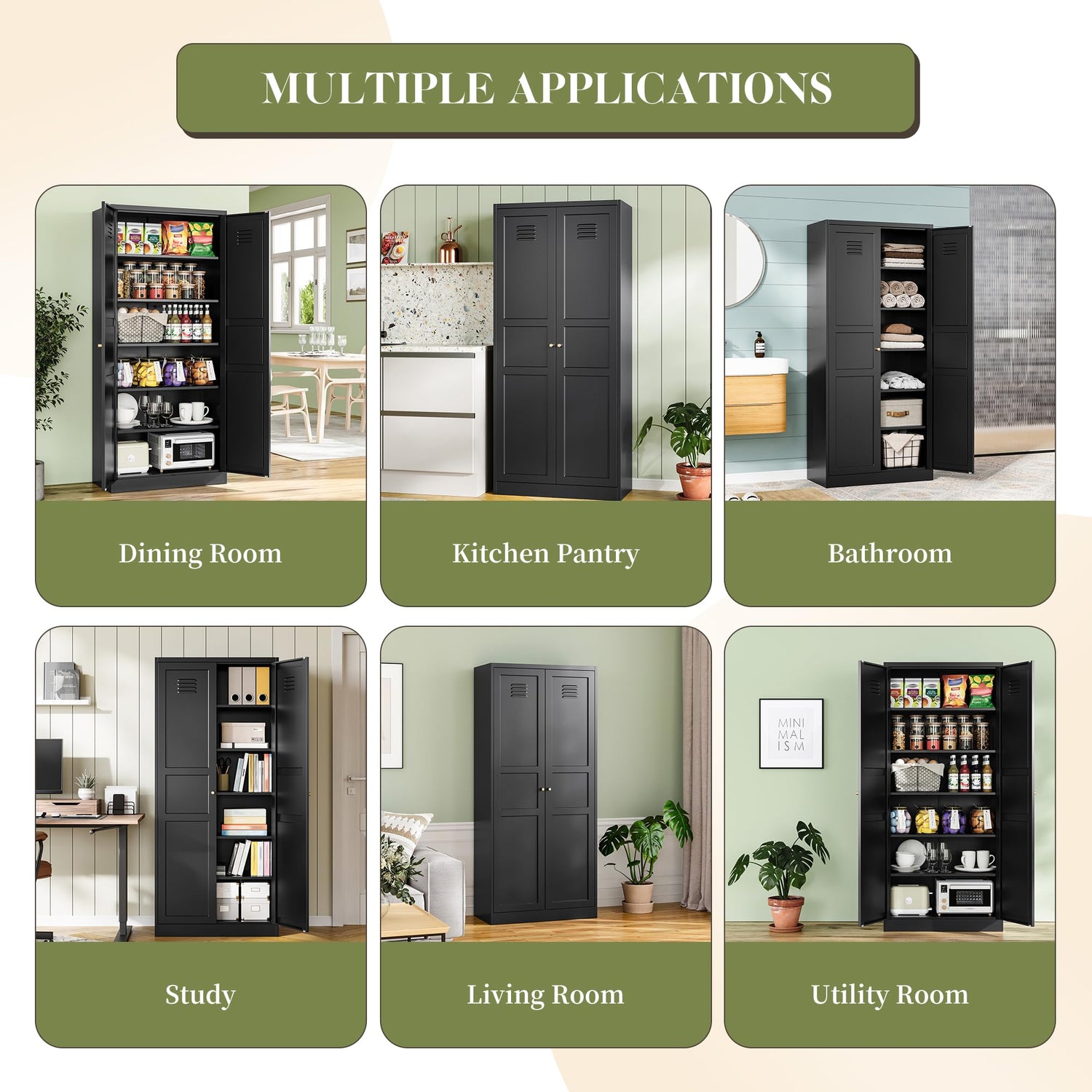RAVIGIN Metal Storage Cabinet,71" H Pantry Cabinet with 2 Doors and 5 Adjustable Shelves,6 Tier Tall Kitchen Storage Cabinets for Kitchen,Pantry,Living/Study/Laundry Room(Black)